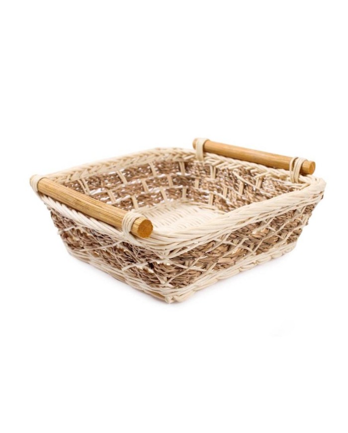 Vyrobený z prírodného materiálu: ratan; tvar: štvorcový; jemne sa zužuje smerom ku dnu; má dve ozdobné drevené rukoväte.