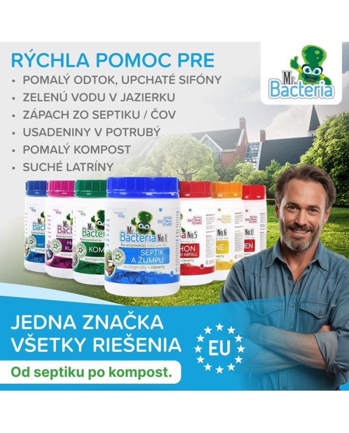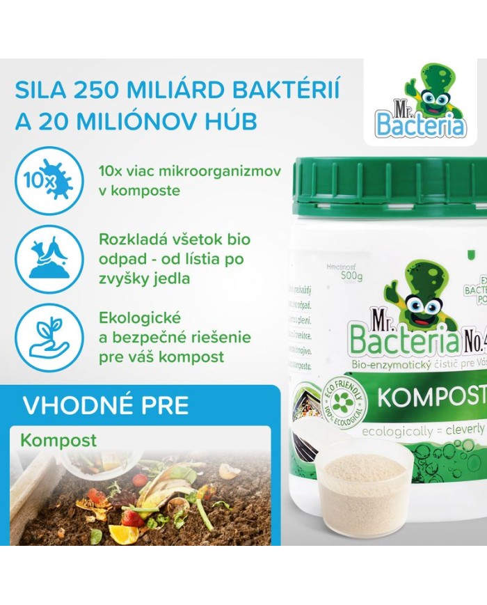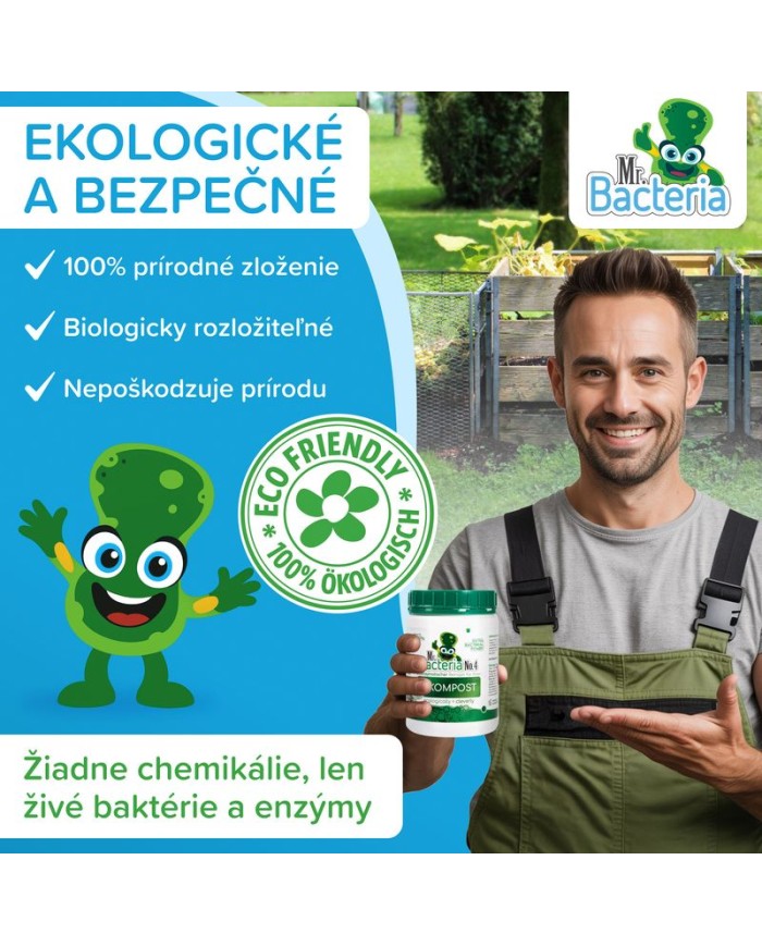 Úplne prírodný a ekologický bio-aktívny prípravok Mr. Bacteria No. 4 urýchľovač kompostu je určený na urýchlenie kompostovania. Obvyklá dĺžka kompostovanie je v rozsahu jedného roka. Prípravok Mr. Bacteria No. 4 vie značne urýchliť proces kompostovania záhradného odpadu a vybraného biologického odpadu z Vašej domácnosti. Mr. Bacteria No. 4 je zmes bakteriálnych kultúr zmiešaných s nespracovanými enzýmami, emulgátormi a živinami, špeciálne navrhnutá pre kompostovanie organických odpadov (odpad po sezónnom prerezávaní okrasných kríkov - štiepka, kôra, piliny, tráva, lístie, ovocie, zelenina, kvety, bioodpad z domácností a pod.). Výrobok funguje v dvoch fázach: urýchlenie naštartovania a výrazné skrátenie celého procesu kompostovania. Použitím prípravku Mr. Bacteria No. 4 dochádza k maximalizácii hnojív hodnôt kompostu. Výsledkom použitia prípravku Mr. Bacteria No. 4. je skrátenie dĺžky kompostovania.
