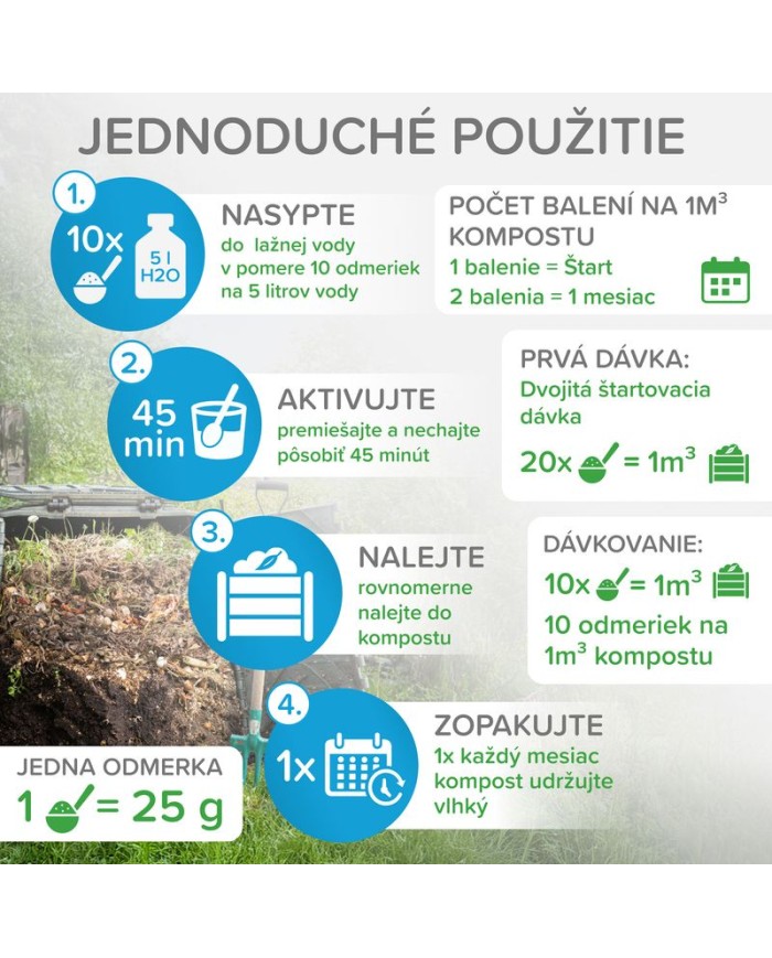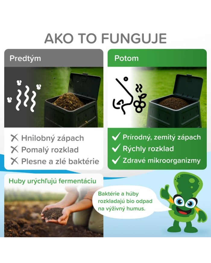 - Urýchľuje zrenie kompostu až o 3 mesiace.