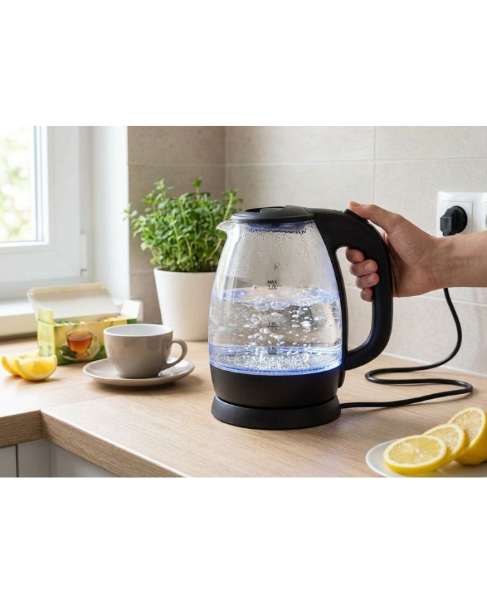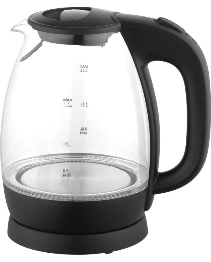 Kanvica disponuje integrovaným LED podsvietením základne, ktoré príjemne osvetľuje obsah nádoby počas varenia. Na tele kanvice je vyznačená prehľadná stupnica s hodnotami od 0,5 L (MIN) až po 1,7 L (MAX), čo zaručuje presné dávkovanie vody bez zbytočného prevarenia väčšieho množstva. Ergonomická rukoväť z odolného plastu zaisťuje bezpečné a pohodlné uchopenie aj pri plnom naplnení nádoby. Odnímateľná otočná základňa umožňuje pohodlné postavenie kanvice na pracovnú plochu z akejkoľvek strany.