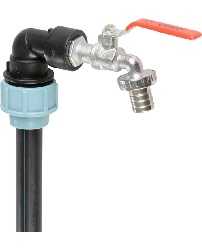 Súprava je navrhnutá pre štandardné IBC nádrže s hrdlom G2" (59 mm) a umožňuje pohodlné napojenie hadice alebo záhradného kohútika pomocou 3/4" pripojenia. Mosadzný guľový ventil s červenou páčkou zaručuje plynulú reguláciu prietoku vody a dlhú životnosť aj pri bežnom vonkajšom používaní. Plastové tlakovité spojky (PP kompresné spojky) v charakteristickej svetlomodrej farbe zabezpečujú pevné a tesné spoje bez nutnosti špeciálneho náradia.