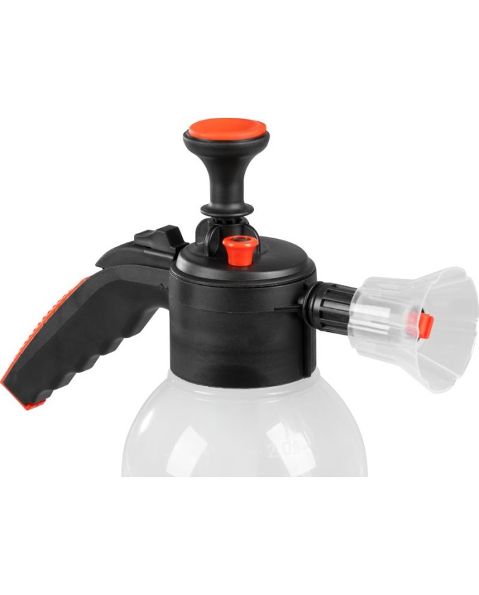 Transparentná nádoba uľahčuje kontrolu hladiny roztoku a široký závit zabezpečuje jednoduché plnenie aj čistenie. Nastaviteľná tryska umožňuje meniť šírku i hustotu peny podľa potreby – od jemného rozprašovania až po hustú penovú aplikáciu.