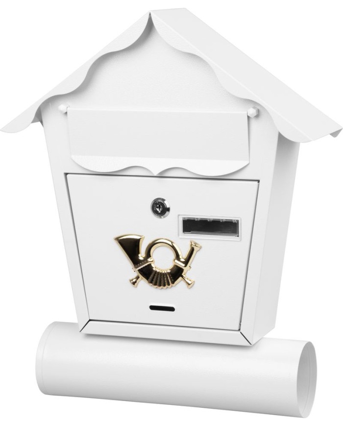 Elegantná poštová schránka v bielej farbe. Obsahuje časť na letáky. Rozmery: 37x10x44 cm. Materiál: kov.