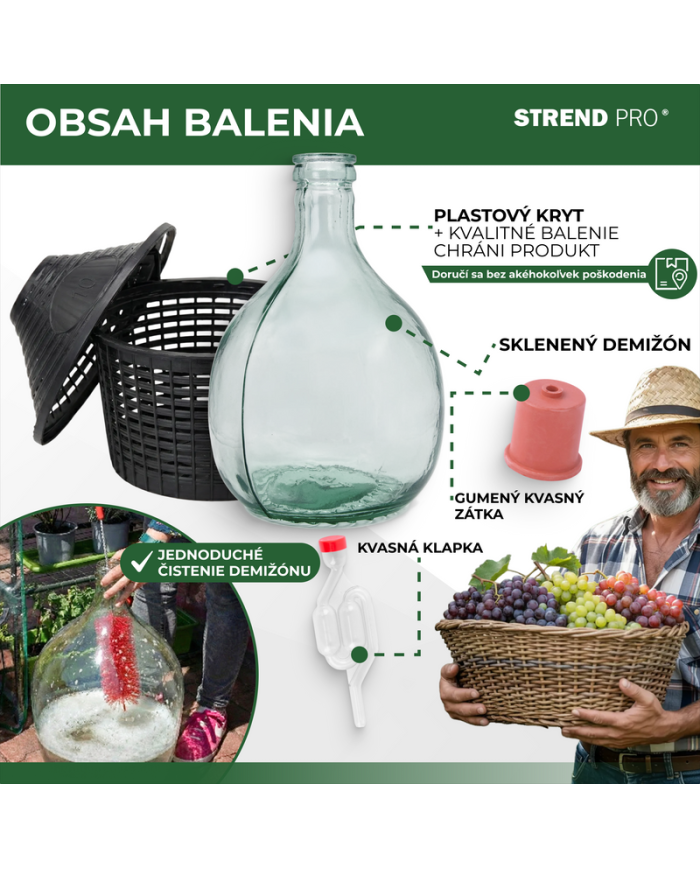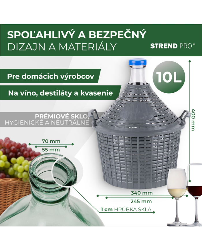 Demižón Strend Pro Cada Inco slúži na uskladnenie tekutín (víno, destiláty). Disponuje 2 úchopmi, je vyrobený zo skla a je vsadený do plastovej ochrany. Jeho objem je 10 litrov a jeho rozmery sú 400x340/245 mm. Zátka je súčasťou demižónu. Priemer hrdla 55 mm.