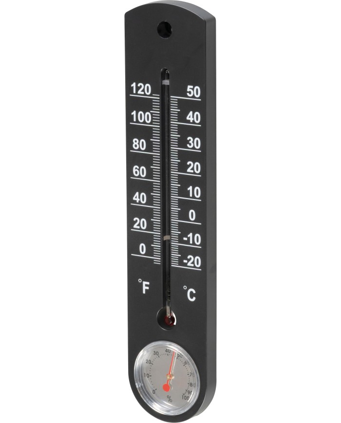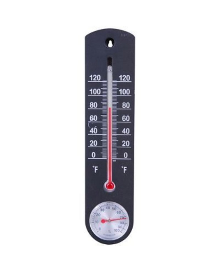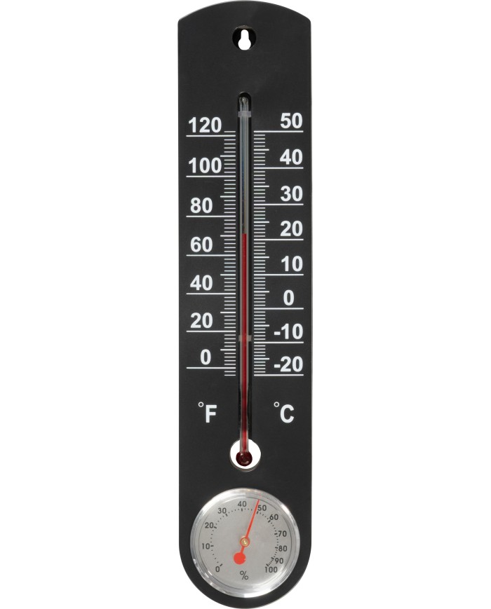 Vonkajší teplomer Strend Pro meria teplotu v rozsahu od 50°C do -20°C. Na spodnej časti obsahuje vlhkomer. Rozmery: 250x50x10 mm.