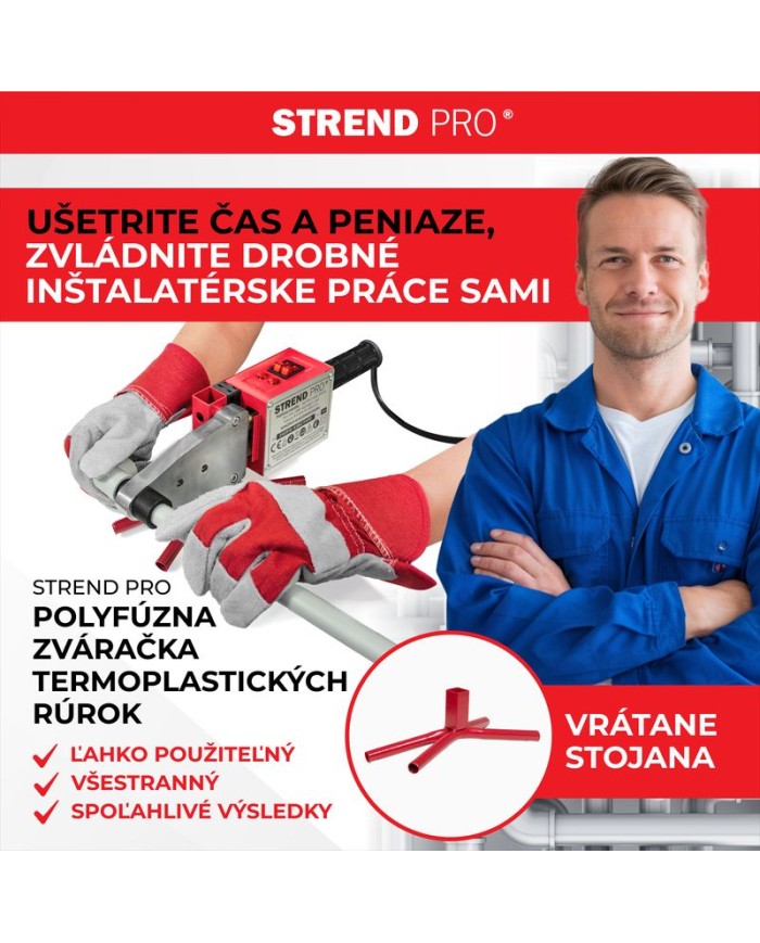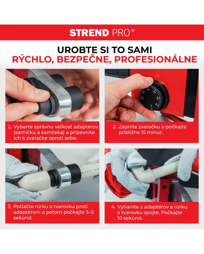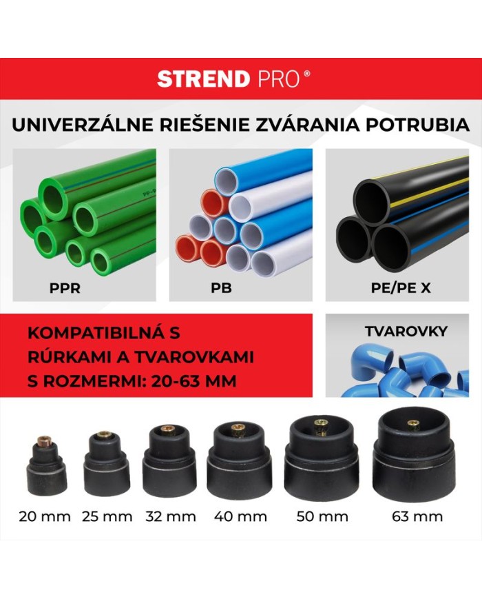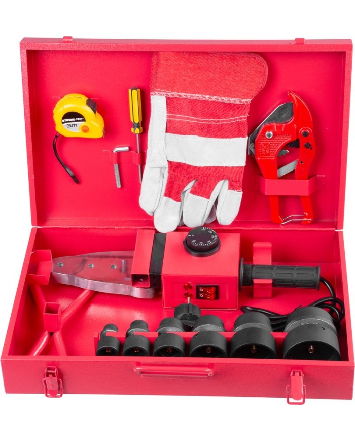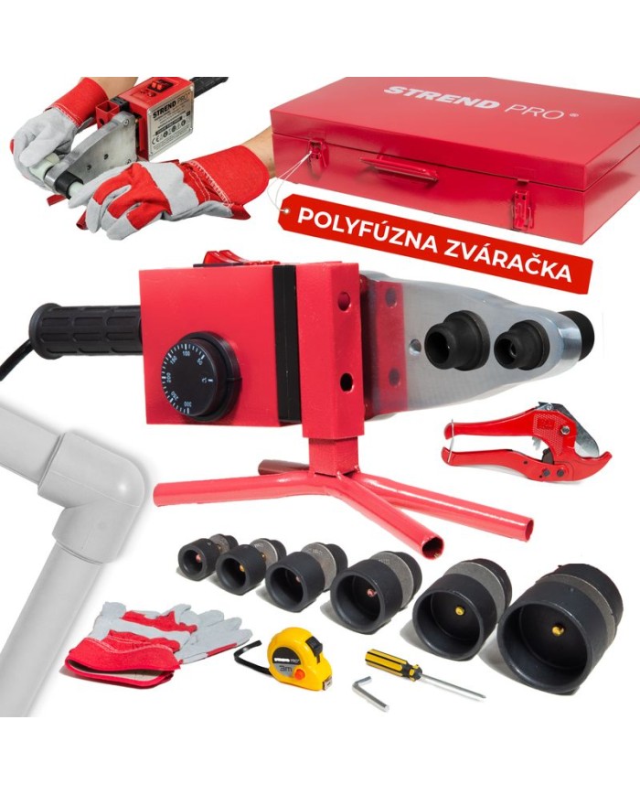 Obsah balenia: - nadstavce 20-63 mm - nožnice na plastové rúrky - rukavice - skrutkovač - imbusový kľúč - meterZváračka Strend Pro PPR 63B, polyfúzna, 1500W, 20-63 mm, na plastové rúrky, 14 dielna