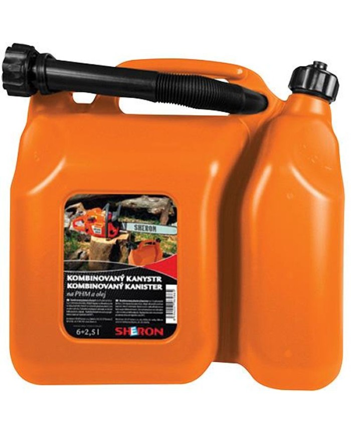 Plastový kanister značky Sheron na pohonné hmoty a olej s objemom 6 litrov pre pohonné hmoty a 2,5 litrov pre olej.