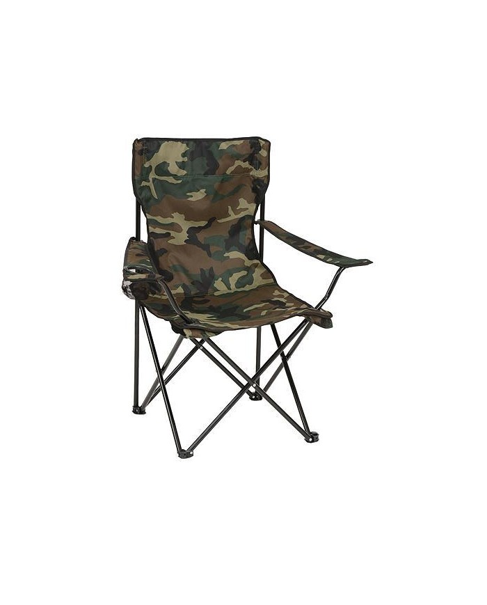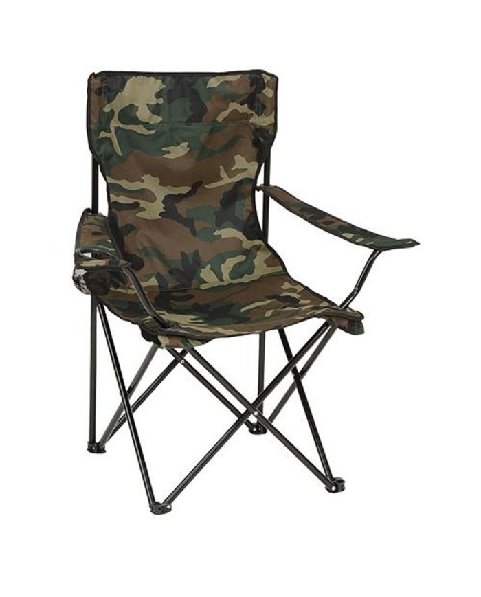 Skladacia stolička je ideálna na prenos a uskladnenie. Nezaberá veľa miesta, čím je možné vziať ju so sebou kamkoľvek potrebujete. Stolička je vyrobená z kovu, ktorý poskytuje stabilitu a pevnosť. Vrchná časť je pokrytá odolným oxfordovým materiálom, ktorý má kamuflážovú potlač. Rozmery rozloženej stoličky sú 85 x 50 x 85 cm a jej nosnosť je 120 kg. Stolička má po oboch stranách opierky na lakte, pričom sa v pravej nachádza otvor pre umiestnenie fľaše alebo pohára s nápojom.