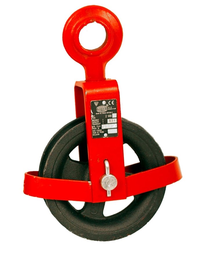Použitie: Slúži ako prenosné náradie na montážne a murárske práce pri zdvíhaní a ťahaní bremien ručnou silou ťahom konopného alebo polyamidového lana. S okom a chráničom.