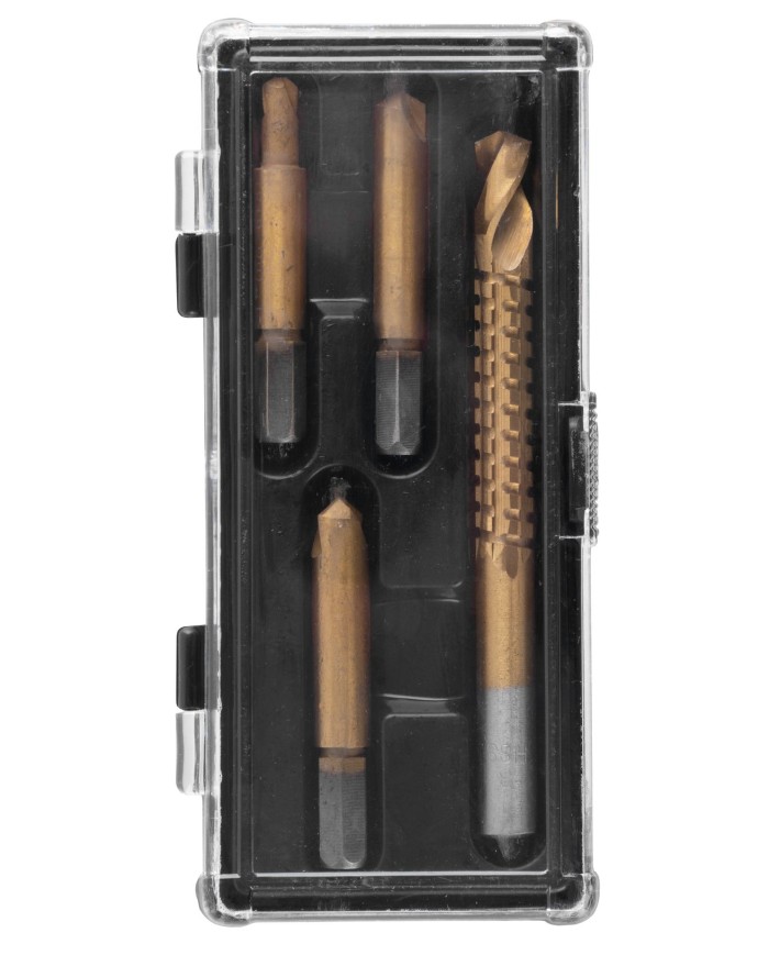 Na rýchle rozobratie skrutkových spojov. V sade nájdete 4 rôzne vyťahovače zalomených skrutiek,závitové hlavice pre dostaočnú silu v ťahu. S touto sadou efektívne vytiahnete poškodené skrutky z dreva.