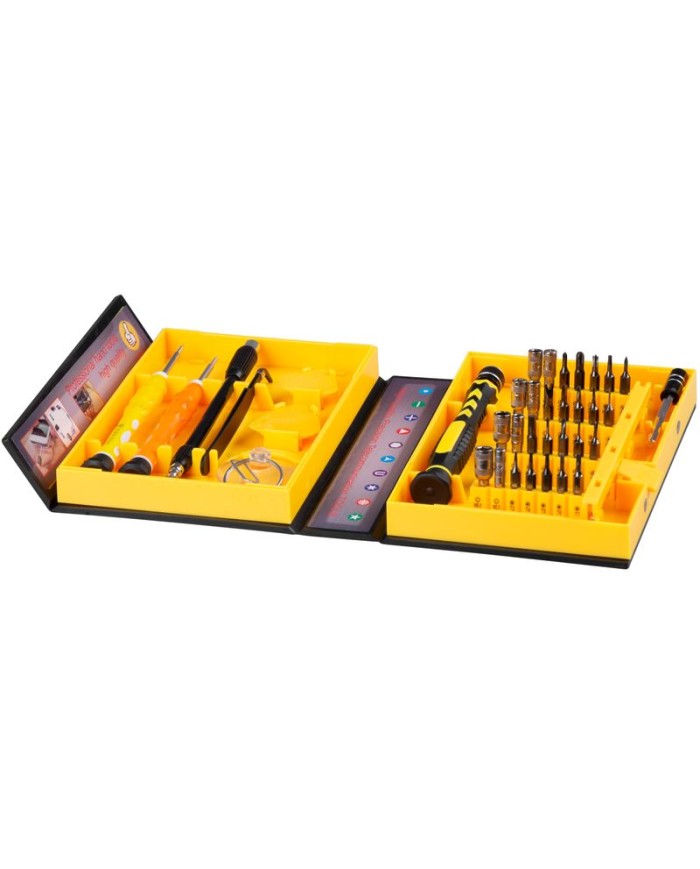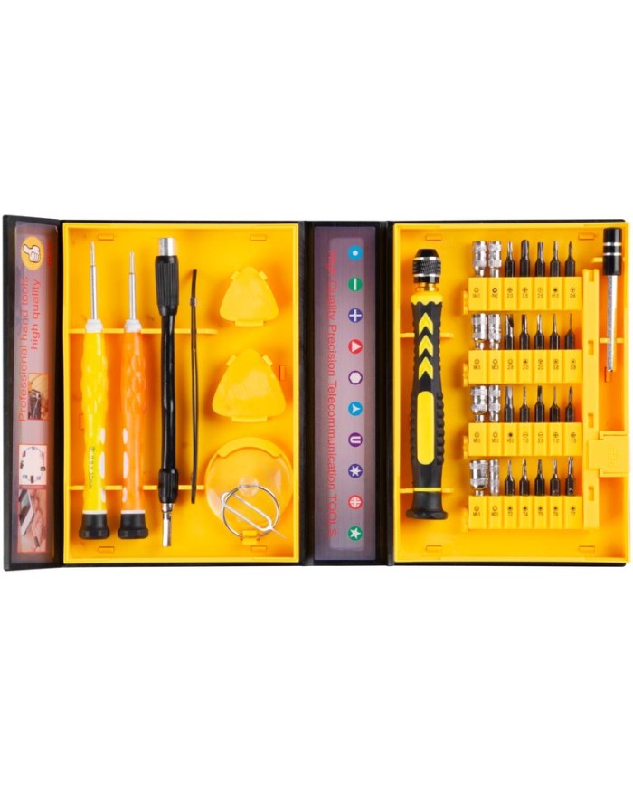 Sada hodinárskych skrutkovačov v žltom rozložiteľnom kovovom puzdre zahrňa - krížový skrutkovač -1,5 mm,skrutkovač hviezda - 0,8 mm, skrutkovač s výmennými bitmi.Orechy pre šesťhranné skrutky-2,5 -5,5 mm,bit pre vonkajšiu bitovú hlavu PH2,bit Torx- T3-T15, plochý bit -1,5 mm,2 mm, krížový bit -1,2 mm,1,5mm, 2 mm. Trouholníkový bit-2,3 mm, bit s hviezdou - 0,8 mm, 1,2 mm, bit s trojcípou hviezdou - 2 mm, plochý bit s drážkou 2,6 mm, nadstavec na bity, dve špachtle, pinzetu,prísavku, nástroj na otvorenie slotu SIM, Ohybný nadstavec na bity.