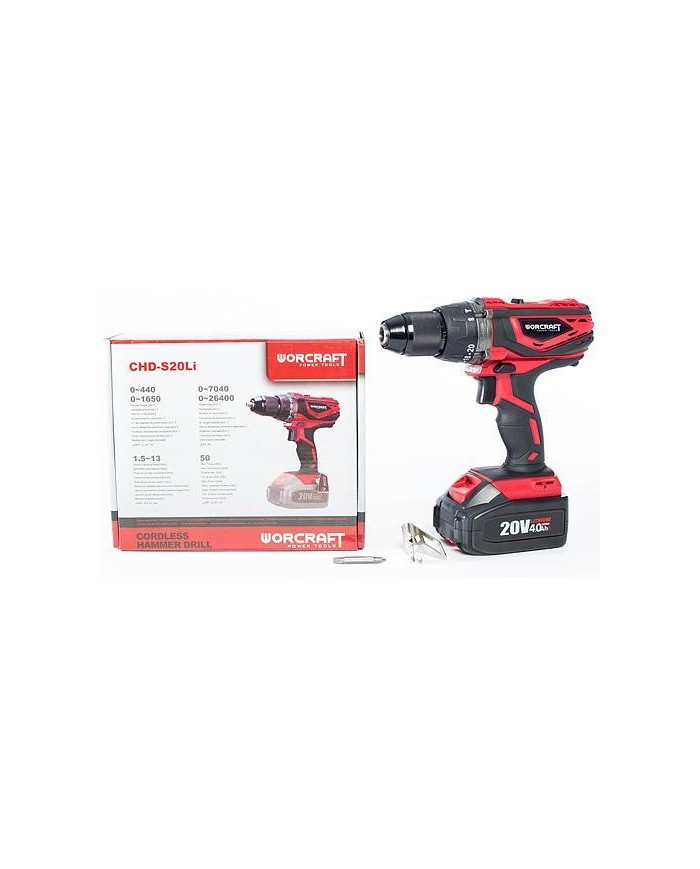 Skrutkovač Worcraft CHD-S20Li s upínacím priemerom 13 mm je určený na vŕtanie do dreva, kovu, keramiky, plastu a betónu. Taktiež je vhodný na skrutkovanie a rezanie závitov. Skrutkovač pracuje maximálnou rýchlosťou 1650 otáčok/min. Je vybavený elektronickou reguláciou otáčok. Otáčky je možné regulovať otáčaním doľava/doprava. Skrutkovač s maximálnym počtom príklepov 26400 bpm poskytuje maximálny krútiaci moment 50 Nm. Disponuje možnosťou nastavenia krútiaceho momentu v 21 krokoch, čo slúži k tomu, aby sa zabránilo poškodeniu hláv skrutiek alebo vrtákov. Otáčaním regulačného gombíka je možné nastaviť krok od 1 (skrutky s ľahkým otáčaním) po 21 (skrutky s ťažkým otáčaním alebo náročné vyvrtávanie). Nastavenie so znakom vrtáku sa používa pre vyvrtávanie.