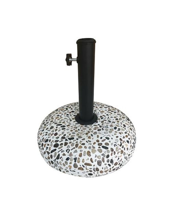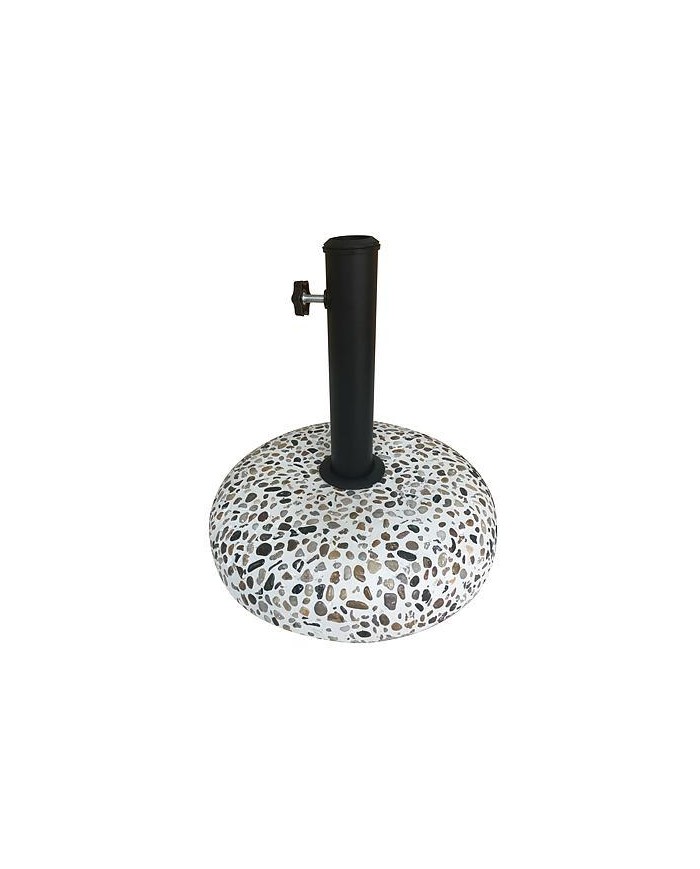 Stojan na slnečník má kruhový základ vyrobený z betónu. Jeho vrchný poťah pripomína mozaiku z malých kamienkov, čo vytvára pekný vzhľad. Hmotnosť stojana je 15,5 kg a preto poskytuje dostatočne pevný podklad pre dážniky a slnečníky. Zo stredu podstavy, ktorje priemer je 35 cm a výška 8 cm, vychádza tyč, do ktorej sa nasúva slnečník. Po jeho vložení stačí iba zakrútiť koliesko na bočnej strane, čím slnečník dostatočne zaistíte. Maximálny priemer možnej upevnenej tyče je 33 až 41 mm.