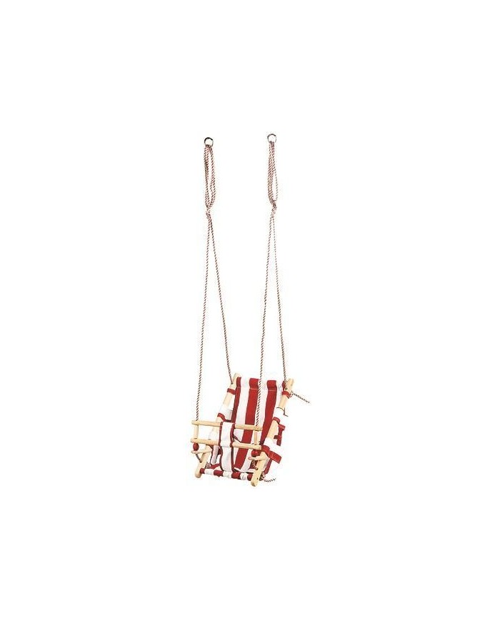 Plátená detská hojdačka červenej farby je prispôsobená pre tých najmenších. Vďaka svojmu polo-ležatému tvaru do nej jednoducho dieťa uložíte. V prednej časti hojdačky sa nachádza drevená zábrana voči vypadnutiu. Drevené časti sa pre spevnenie celej hojdačky nachádzajú aj po bokoch sedacej časti. Na bokoch hojdačky sú umiestnené laná s priemerom 10 mm a dĺžkou 2 m. Potrebnú dĺžku lán si viete manuálne nastaviť a zauzliť. Na predom našrubované háky vložíte kovové oká na koncoch lán. Po tomto kroku je už možné bezpečne sa hojdať. Nosnosť je 70 kg a rozmery sú 36 x 24 x 45 cm.