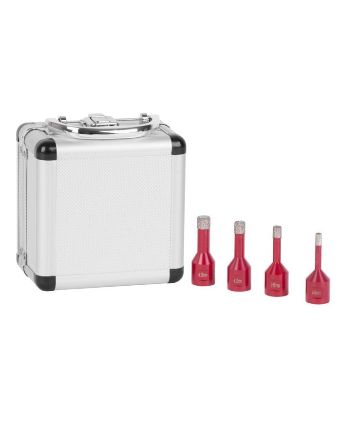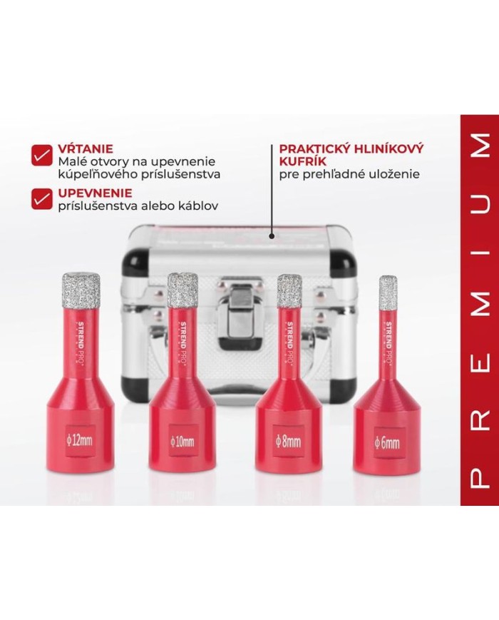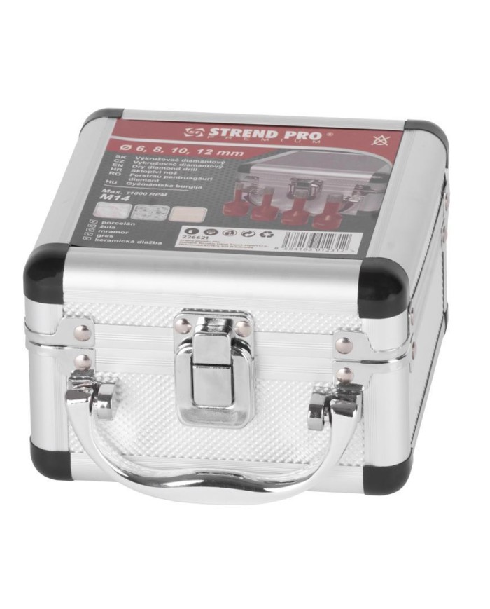 Sada vyrezávačov Strend Pro Premium by nemala chýbať vo výbave profesionálnych remeselníkov, ale aj domácich kutilov. Pozostáva zo 4 vyrezávačov s rozmerom 6, 8, 10 a 12 mm. Disponuje typom upnutia M14 a maximáne povolené otáčky sú 11 000 rpm. Používa sa na porcelán, žulu, mramor, gres a keramickú dlažbu.
