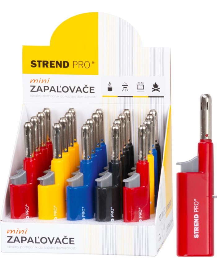 Zapaľovač Strend Pro je vhodný na akékoľvek použitie pri zapaľovaná. Opätovne plniteľný. Druh plynu: propán-butánová zmes. Sellbox obsahuje 20 ks zapaľovačov čiernej, červenej, žltej a modrej farby. Uvedená cena je za 1 ks.