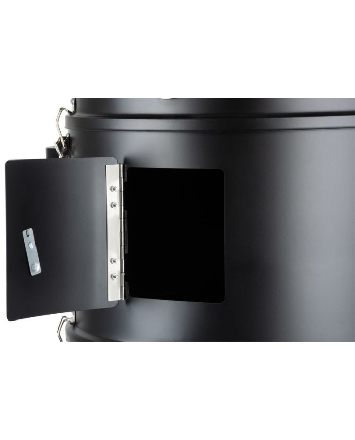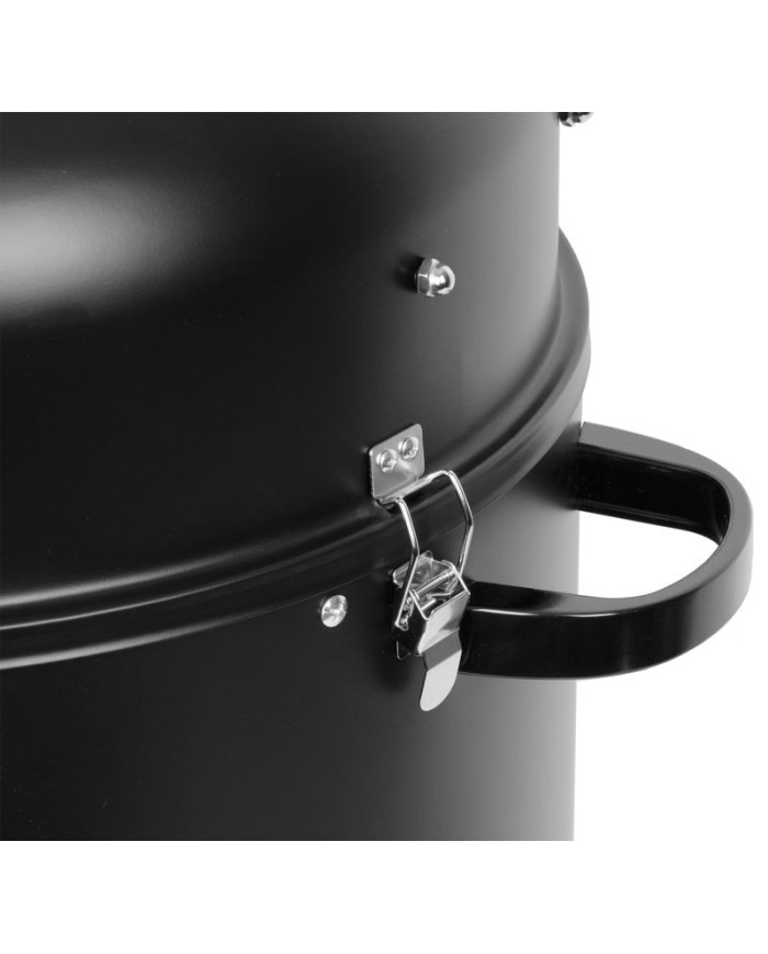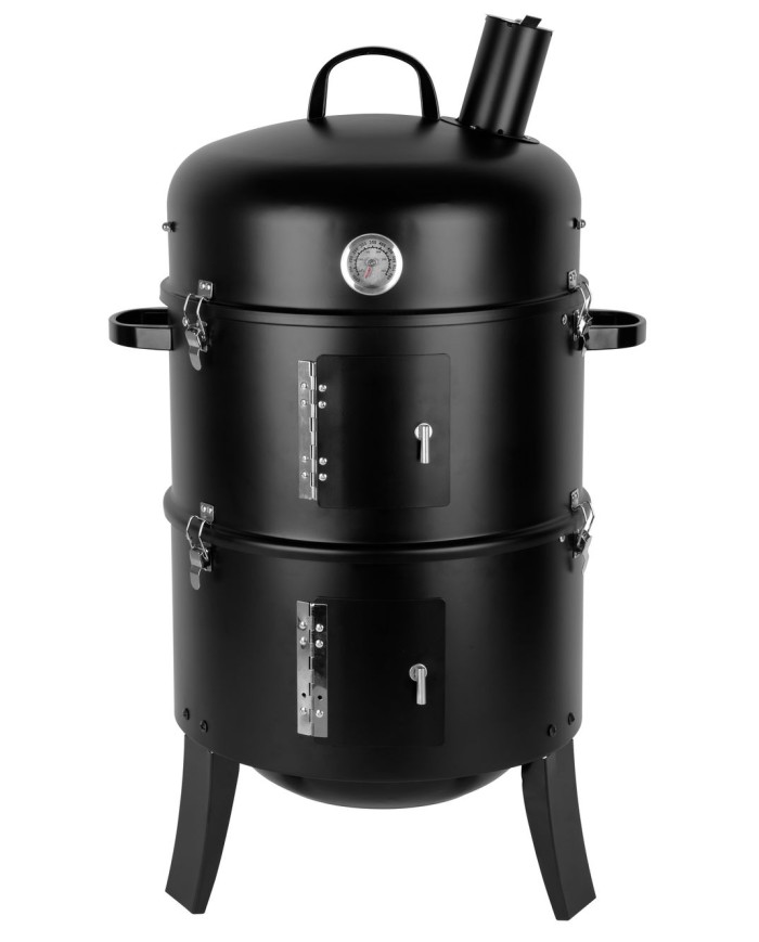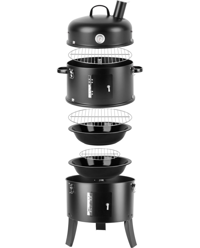 Gril je praktický multifunkčný domáci pomocník, ktorý ponúka bohaté možnosti nie len grilovania, ale tiež klasického či parného údenia. Celý gril sa skladá z troch poschodí. V prípade grilovania, nie údenia, však nie je nutné založiť všetky tri, postačia iba dve časti. Prvá vrchná časť slúži na grilovanie, preto je v nej umiestnená kovová mriežka. Priemer grilovacej mriežky je 44 cm. V prípade potreby je možné zakryť ju vrchným krytom s rozmermi 41 x 16,5 cm. Súčasťou krytu je malý komín, ktorý slúži ako vetrací ventil. Spodná časť slúži zasa na kúrenie, teda umiestnenie potrebného uhlia alebo dreva. Na spodnej časti sa tiež nachádzajú dvierka, ktoré sa dajú otvoriť a dá sa nimi regulovať intenzita ohňa. Spodnú časť je možné samostatne použiť aj ako otvorené malé ohnisko na terase. V prípade údenia je potrebné založiť strednú časť, v ktorej sa nachádza kovová nádoba s vodou. Výhodou parného údenia je, že sa nevysušuje mäso. Všetky tri časti do seba jednoducho zaistíte bočnými poistkami, čo zabezpečí stálu teplotu. Celý gril je čierny, vyrobený z plechu hrubého 0,4 mm a je vysoký 78,5 cm. Z dôvodu priamej práce s ohňom je potrebné dbať na dostatočnú bezpečnosť pri manipulácii, zabezpečiť dostatočnú vzdialenosť prístupu pre deti a kontrolovať veľkosť a intenzitu ohňa pred vzniknutým požiarom.