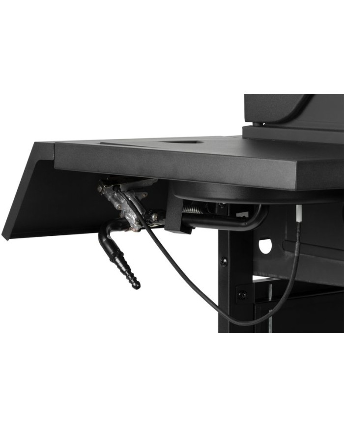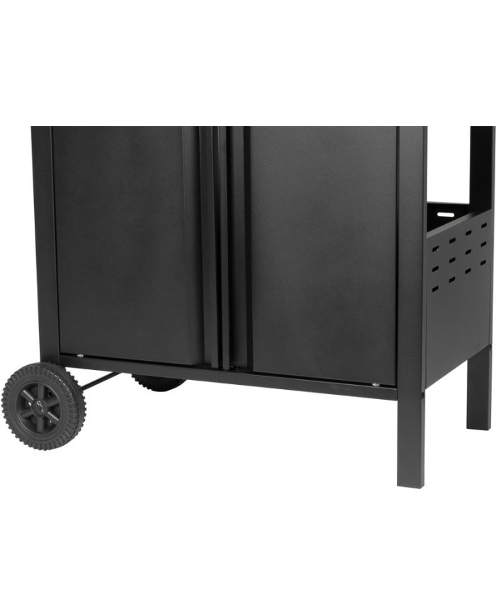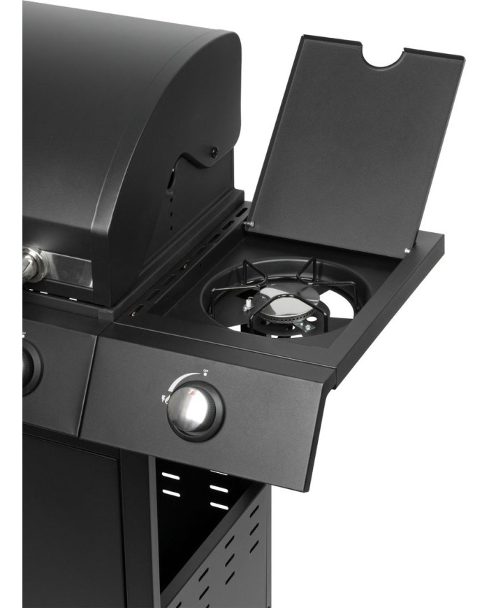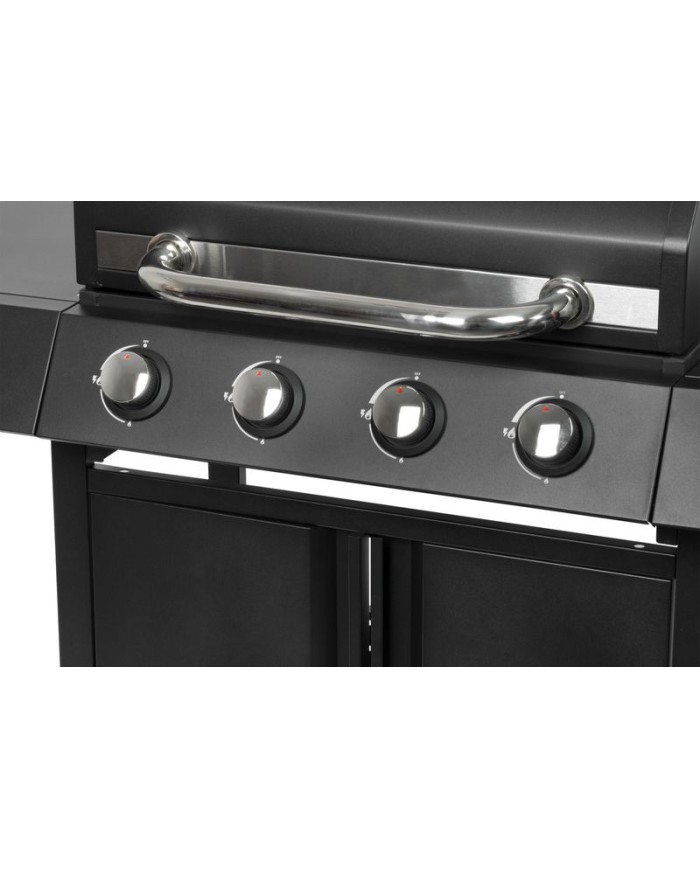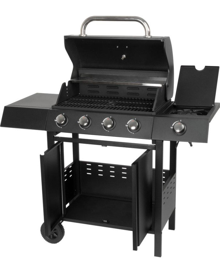 Plynový 4+1 horákový gril je ideálny na rýchlu prípravu jedál. Súčasťou je tiež jeden samostatný horák na pravej strane, pre potrebu jednoduchého varenia vonku. Na ľavej strane sa nachádza menší odkladací priestor, kde si môžeme uložiť grilovacie kliešte a pod. Hlavná grilovacia časť sa nachádza pod vrchným kovovým krytom. Varná mriežka je vyrobená zo smaltovanej ocele. Výhodou grilu je zabudovaný ukazovateľ teploty z nehrdzavejúcej ocele, vďaka čomu nemusíte jedlo neustále kontrolovať. Pod grilovacou časťou sa tiež nachádza odkladací priestor, ktorý môžete využiť na umiestnene plynovej fľaše. Pre funkčnosť grilu sa používa štandardná plynová fľaša s hmotnosťou náplne do 11 kg. Celý povrch je pokrytý krásnou práškovou čiernou farbou. Z hľadiska čistenia na tomto grile oceníte, že sa mastnota po grilovaní odstraňuje veľmi jednoducho. Rozmery grilu sú 120 x 53 x 110 cm. Hmotnosť je 28,5 kg, teda nie je ideálny na každodenné prenášanie. V prípade potreba je však podstava vybavená dvomi kolieskami, ktoré vám nutný prenos uľahčia.