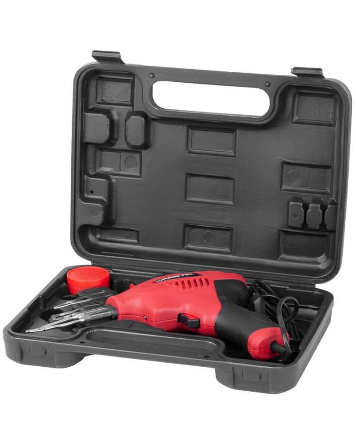 Spájkovacia pištoľ disponuje kompaktnými rozmermi a nízkou hmotnosťou. Je vybavená praktickým LED osvetlením a pogumovanou rukoväťou pre lepšie uchopenie. Teplotu je možné regulovať podľa potreby a vykonávanej činnosti (spájanie/ rezanie plastu 70 – 200° C, mäkké spájkovanie 200 – 350° C, vypaľovanie symbolov na drevo a mäkké spájkovanie 350 – 500° C). Spájkovacia pištoľ a príslušenstvo sú dodávané spolu, v praktickom kufríku.