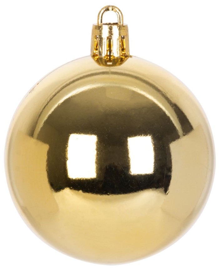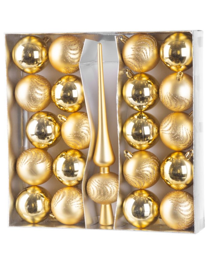 Súprava ozdôb na stromček slúži na slávnostné ozdobenie vianočného stromčeka. Pozostáva z 20 ks gulí s priemerom 6 cm a zo špica s rozmerom 28x6 cm. Farba ozdôb je zlatá. Sú vyrobené z plastu.