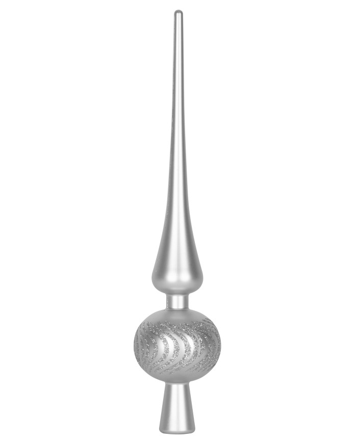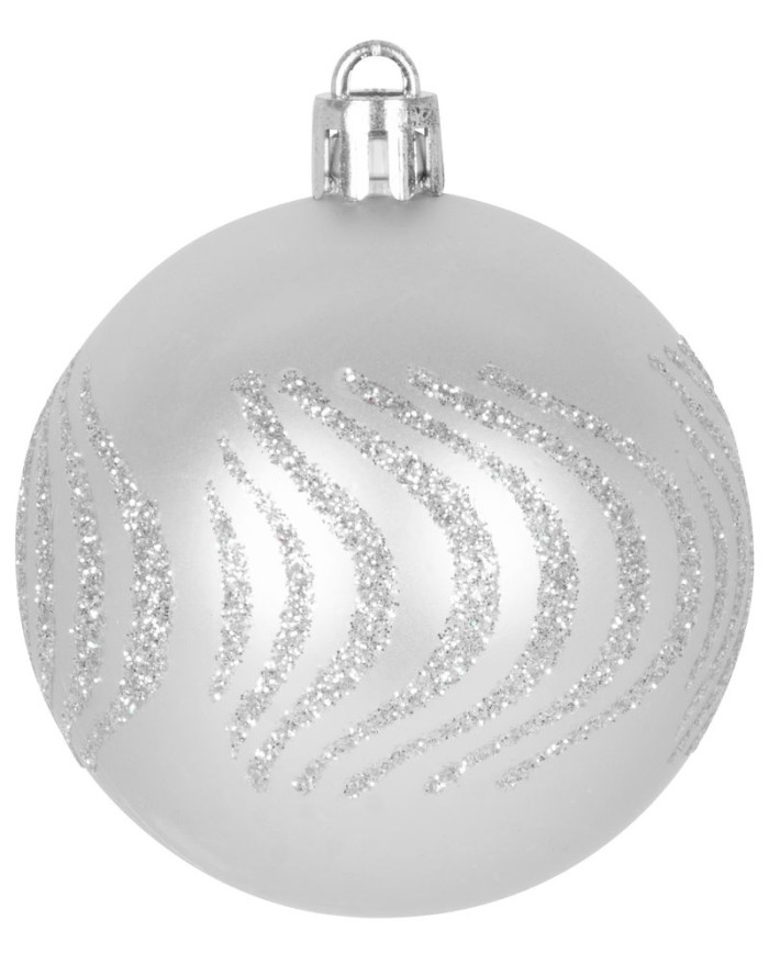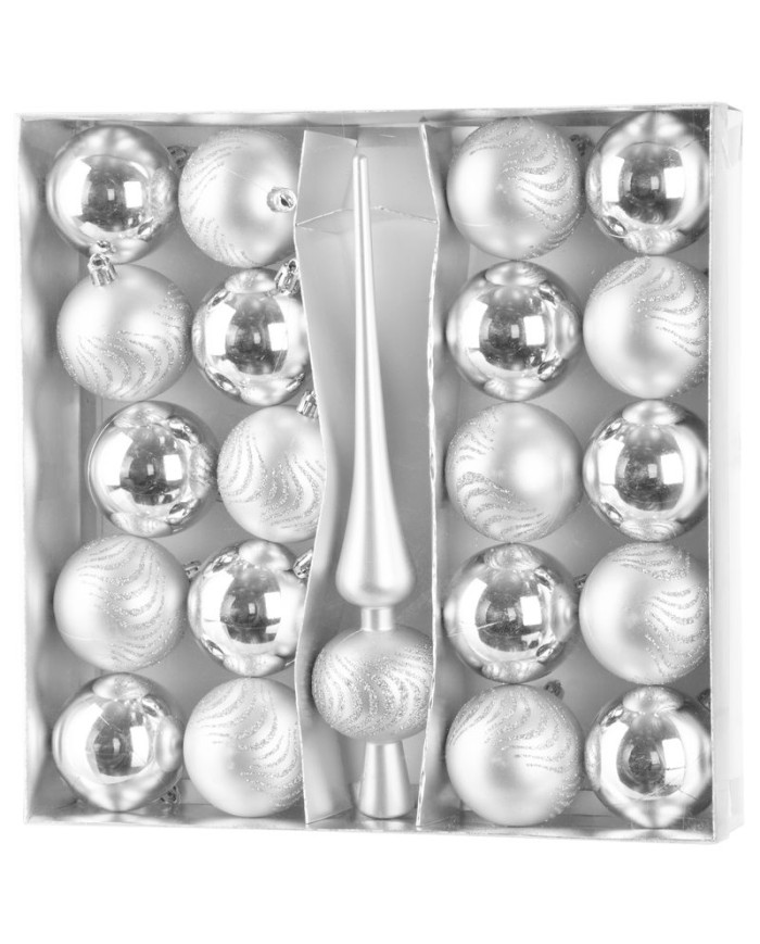 Súprava ozdôb na stromček slúži na slávnostné ozdobenie vianočného stromčeka. Pozostáva z 20 ks gulí s priemerom 6 cm a špica s rozmerom 28x6 cm. Farba ozdôb je strieborná. Sú vyrobené z plastu.