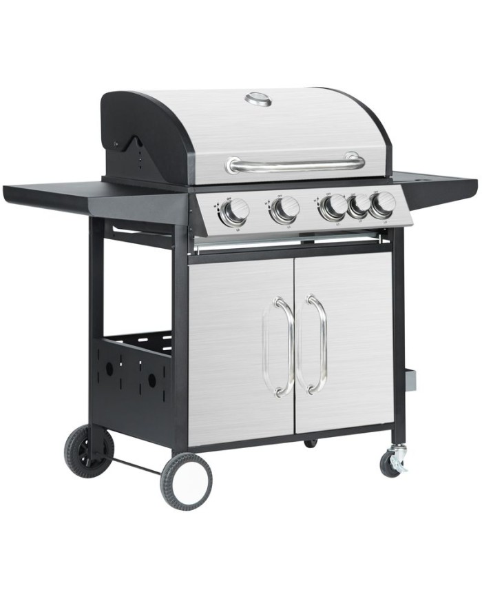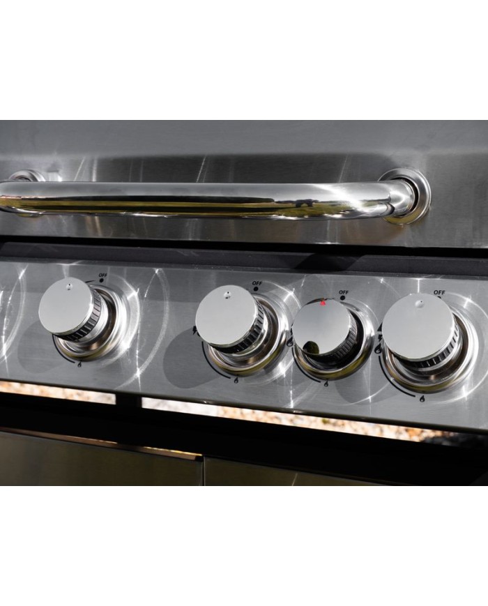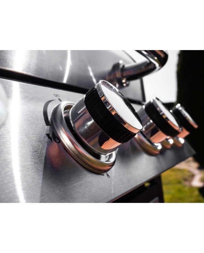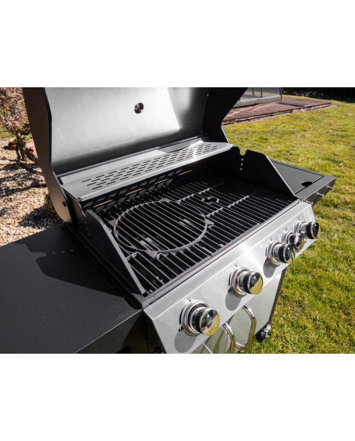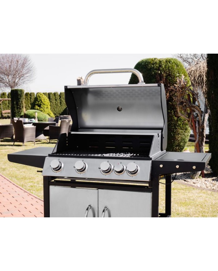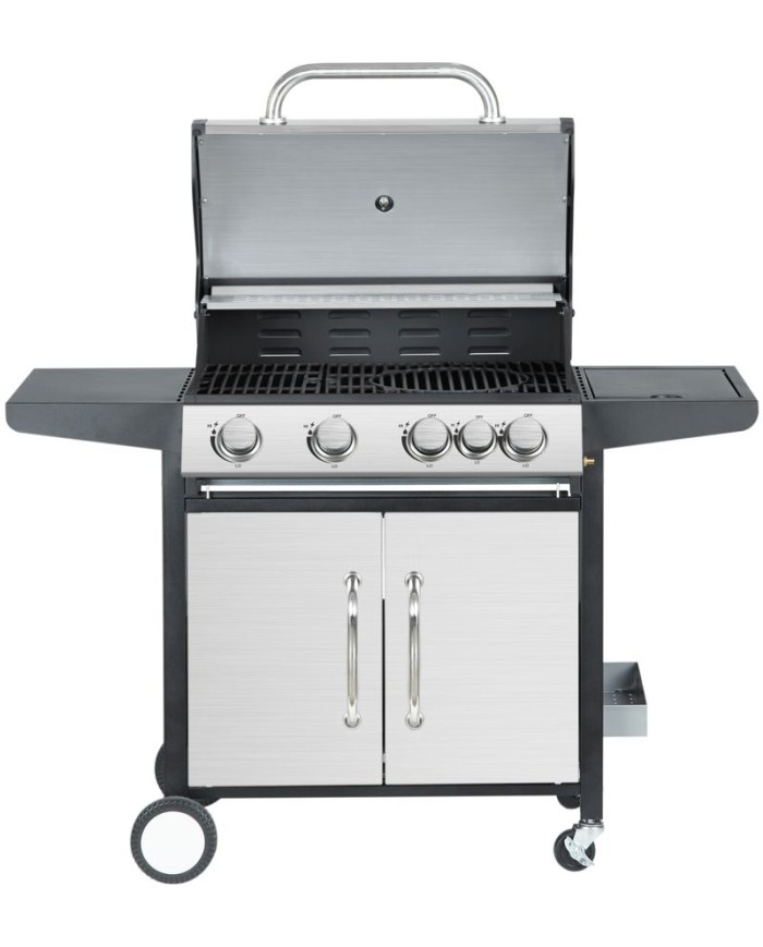 Plynový 4-horákový gril Manresa je ideálny na rýchlu prípravu jedál. Súčasťou je tiež jeden samostatný horák na pravej strane, pre potrebu jednoduchého varenia vonku. Na ľavej strane sa nachádza menší odkladací priestor, kde si môžeme uložiť grilovacie kliešte a pod. Hlavná grilovacia časť sa nachádza pod vrchným nerezovým krytom. Varná mriežka je vyrobená zo smaltovanej ocele. Výhodou grilu je zabudovaný ukazovateľ teploty z nehrdzavejúcej ocele, vďaka čomu nemusíte jedlo neustále kontrolovať. Pod grilovacou časťou sa tiež nachádza odkladací priestor, ktorý môžete využiť na umiestnene plynovej fľaše. Pre funkčnosť grilu sa používa štandardná plynová fľaša s hmotnosťou náplne do 11 kg. Z hľadiska čistenia na tomto grile oceníte, že sa mastnota po grilovaní odstraňuje veľmi jednoducho. Rozmery grilu sú 131 x 57 x 110 cm. V prípade potreby je podstava vybavená 4 kolieskami, ktoré vám nutný prenos uľahčia.