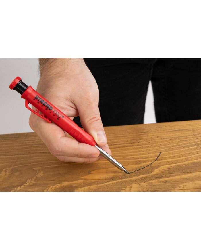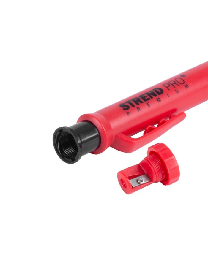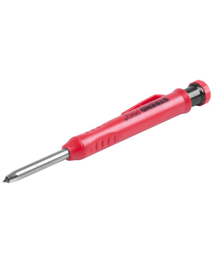 Pevná oceľová tesárska ceruzka Strend Pro so sponou umožňuje svojou konštrukciou aj hĺbkové značenie na ťažšie prístupných miestach. Tuhu vysuniete jednoduchým stlačením hornej časti, ktorá obsahuje aj strúhadlo. Použitie: drevo, kov, tehla, plast. Obsahuje čiernu tuhu tvrdosť HB. Rozmer: 150 mm.