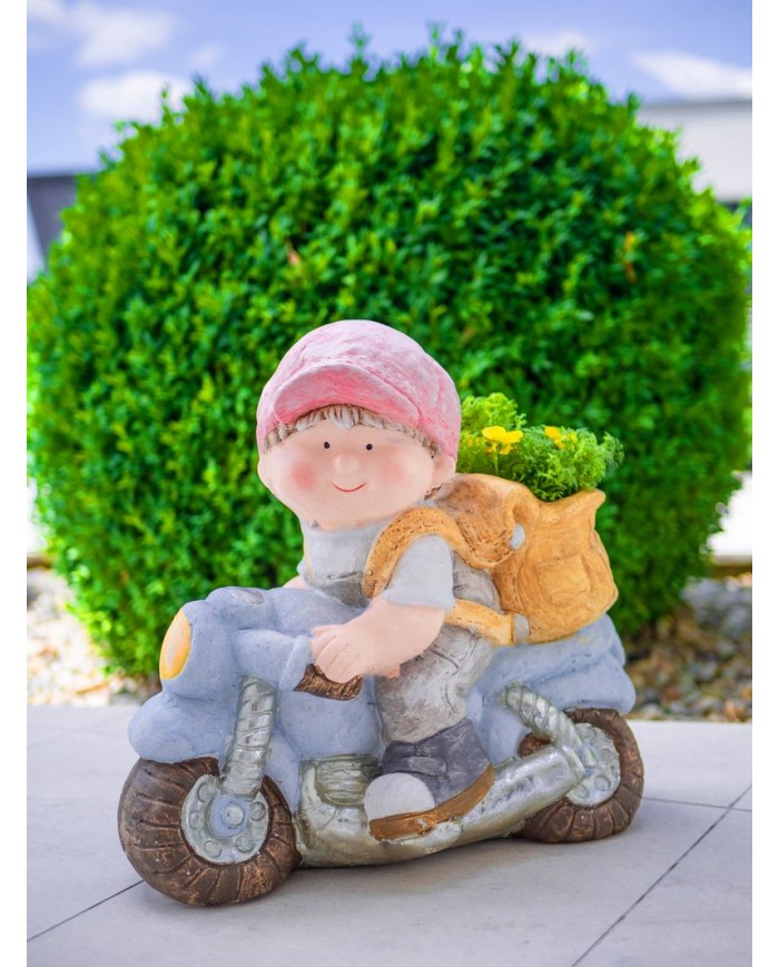 Krásne prepracovaný Chlapček na motorke MagicHome dodá šmrnc Vašej záhrade. Zadnú časť môžete využiť ako kvetináč a zasadiť si tam kvet. Rozmery: 38x20x36 cm.
