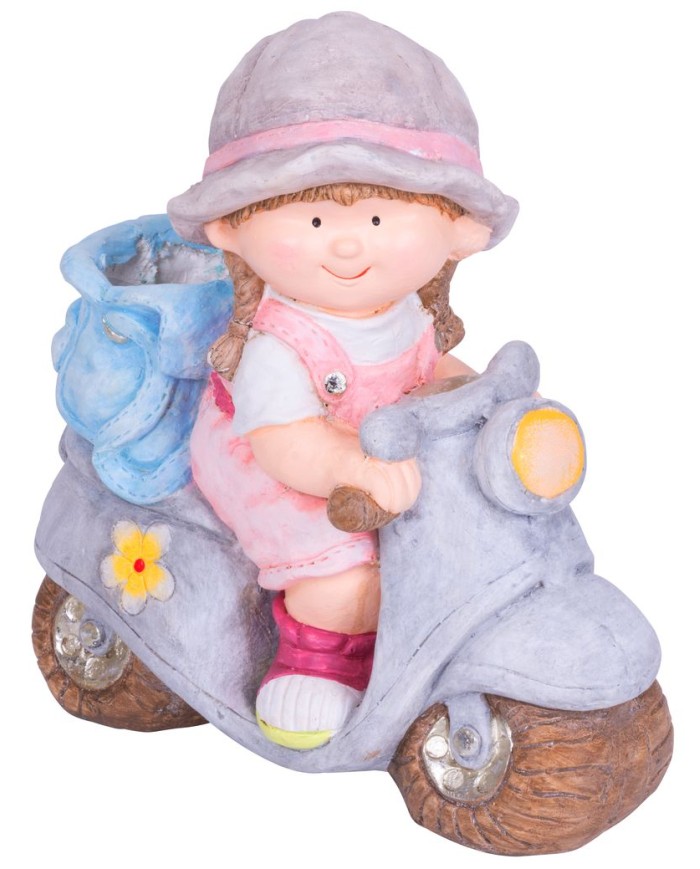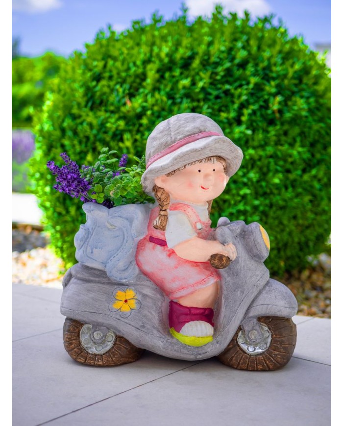 Krásne prepracované Dievčatko na skútri MagicHome dodá šmrnc Vašej záhrade. V zadnej časti si môžete zasadiť kvet. Rozmery: 36,5x17,5x37,5 cm.