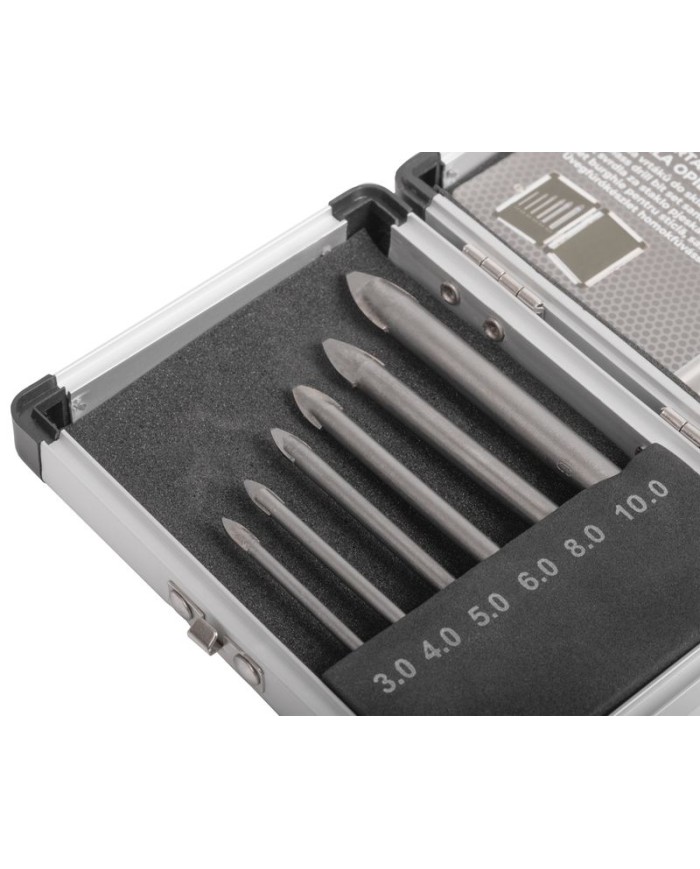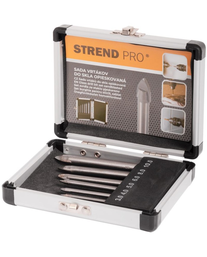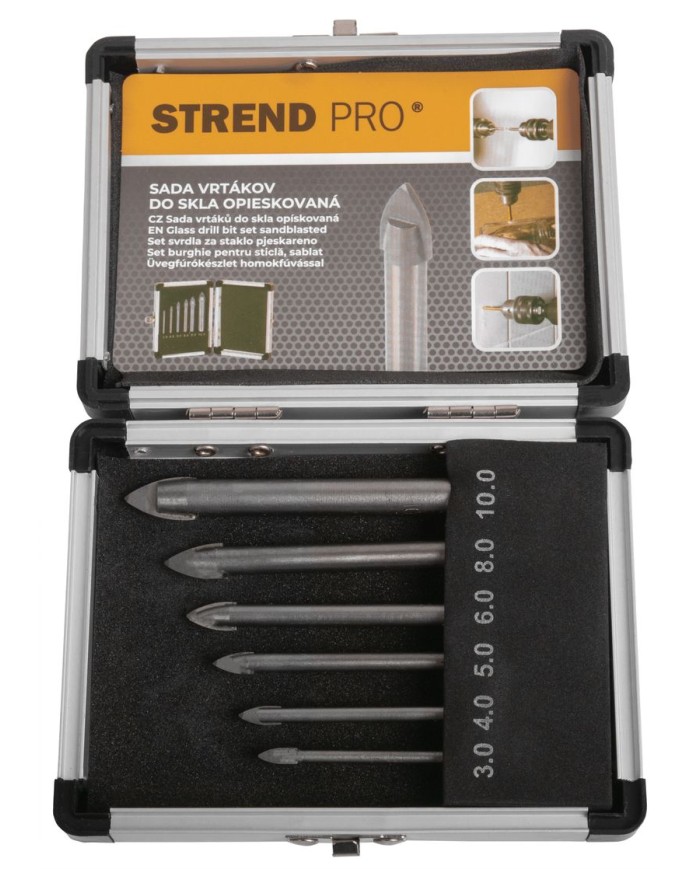 Opieskovaná sada vrtákov Strend Pro na vŕtanie do skla, zrkadla, porcelánu, obkladačiek, dlažby, keramiky a podobne. Materiál - uhlíková oceľ YG6. V praktickom hliníkovom kufríku nájdete vrtáky s rozmermi: ø3x60 mm, ø4x65 mm, ø5x70 mm, ø6x75 mm, ø8x80 mm, ø10x85 mm.
