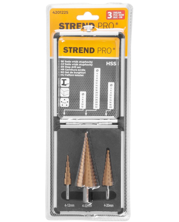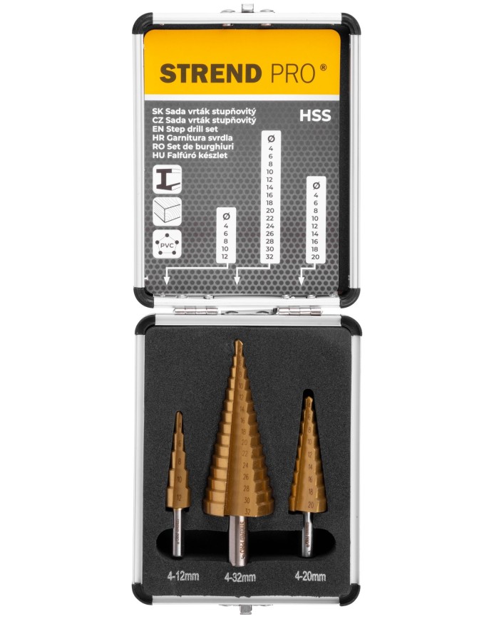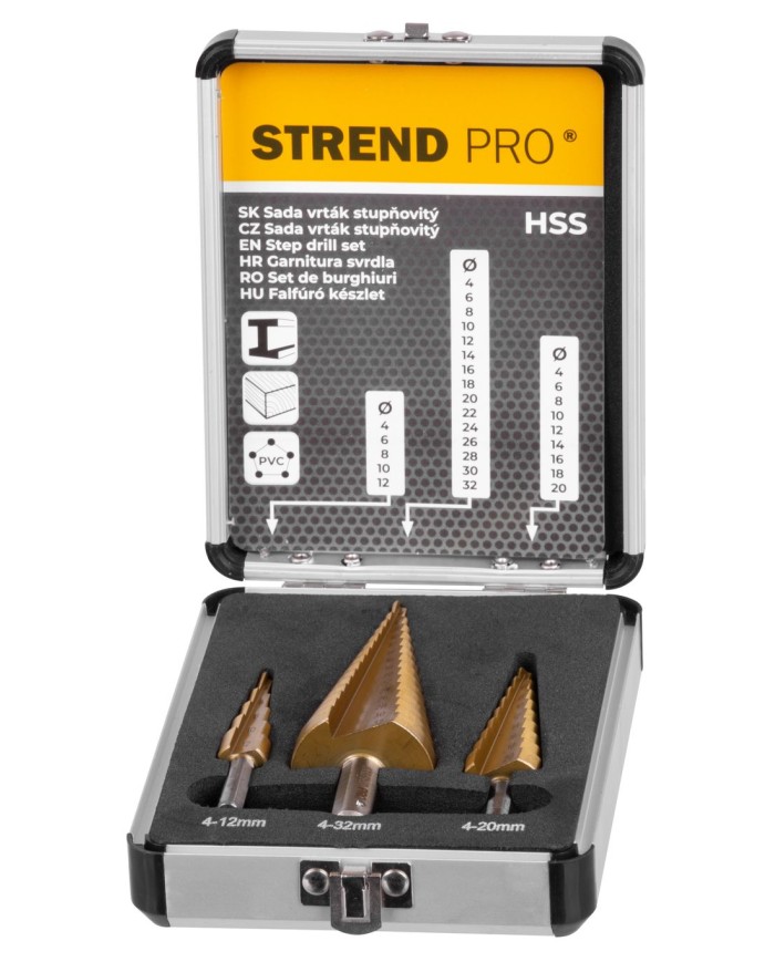 Sada troch stupňovitých vrtákov Strend Pro HSS s titánovou úpravou. Použitie: kov, drevo, plast. V praktickom hliníkovom kufríku nájdete vrtáky s rozmermi: 4-12 mm, 4-20 mm a 4-32 mm.