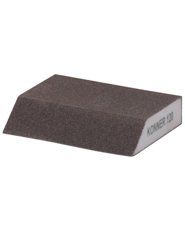 Skosená brúsna huba KONNER je určená na brúsenie sadrokartónov, kovov, plastov, dreva, náterov na tvarované alebo zakrivené aplikácie. Rozmery: 125x90x65x25 mm. Zrnitosť: G120 - vhodná na doleštenie povrchov.Huba je vyrobená z AluOxidu.
