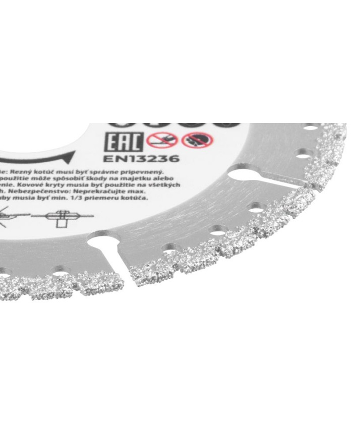 Diamantový rezný kotúč je určený pre domácich kutilov, ale aj pre profesionálnych remeselníkov. Vhodný je na mokré aj suché opracovávanie. Jeho použitie je rozsiahle - tehly, murivo, kameň, dlažba, obklad, strešná krytina, kov, plast, drevo, betón, železobetón, žula, mramor. Je potiahnutý abrazívnym materiálom pre vyšší výkon. Priemer je 115 mm a maximálne povolené otáčky sú 12250 rpm.