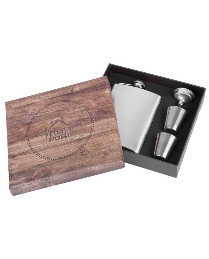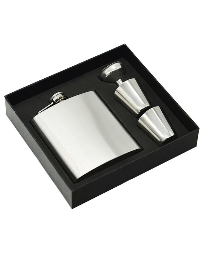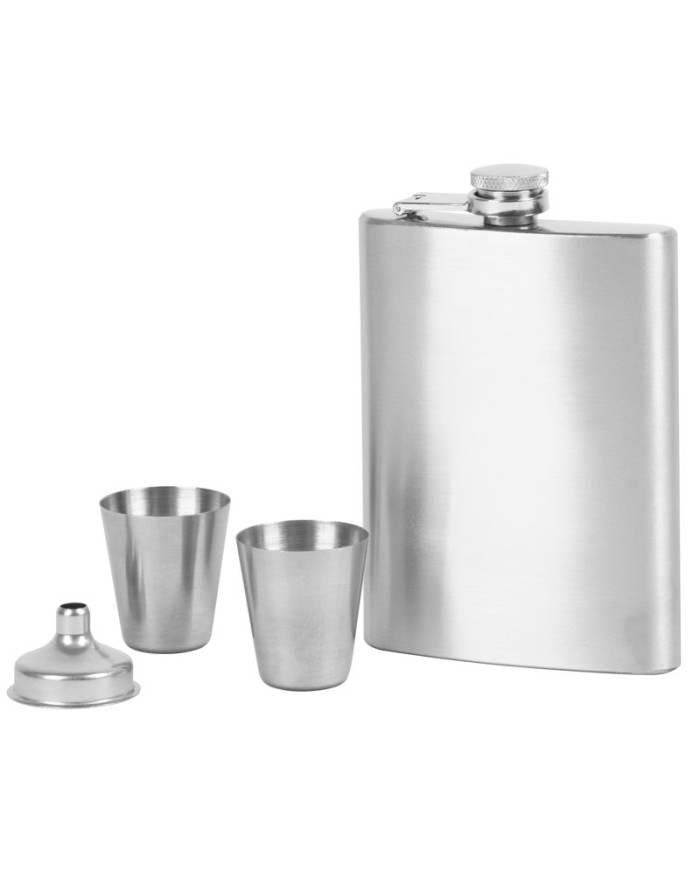 Sada ploskačky a 2 štamperlíkov v darčekovom balení. Ploskačka s objemom 235 ml a štamperlíky s objemom 30 ml sú vyrobené z nerezu. Balenie obsahuje aj lievik pre pohodlnejšie nalievanie nápoja z ploskačky.