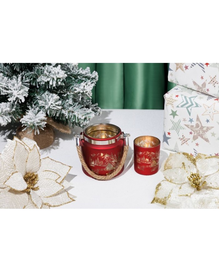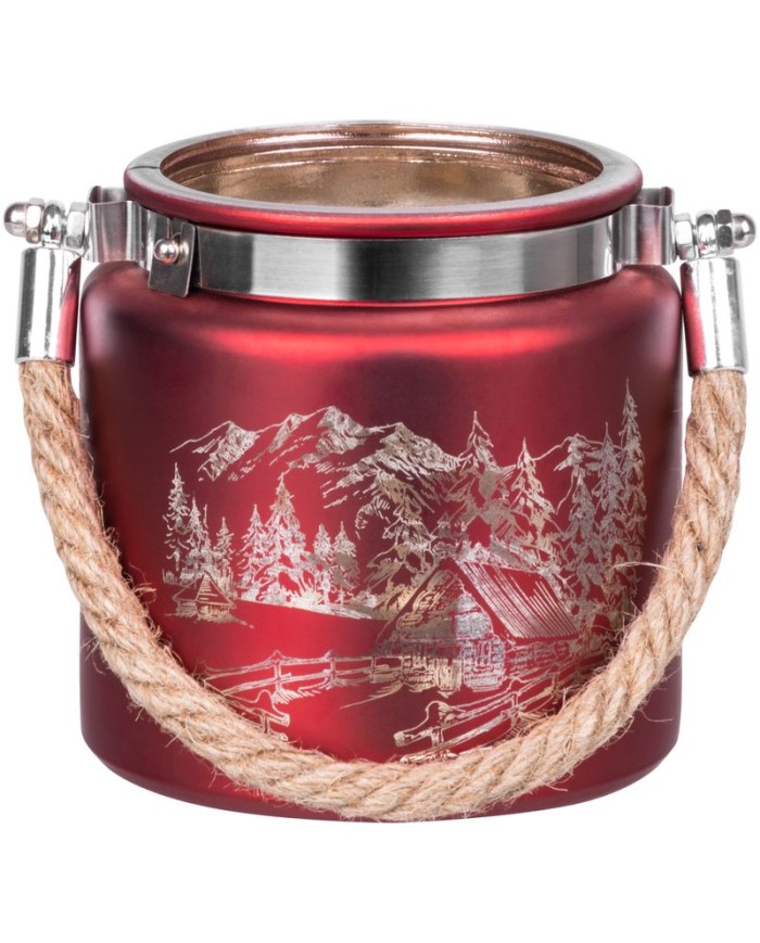Svietnik MagicHome Vianoce, červený, s krajinkou, s lankom, 10x10 cm