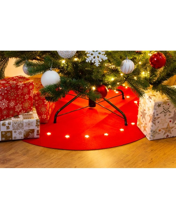 Koberec MagicHome Vianoce, červený, pod vianočný stromček, s hviezdičkami, 22x LED, teplá biela, 2xAA, 90 cm