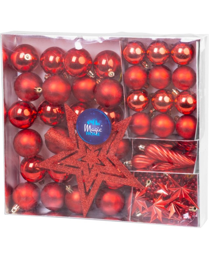 Súprava ozdôb na stromček slúži na slávnostné ozdobenie vianočného stromčeka. Pozostáva z 50 ks ozdôb (gule, hviezda, girlanda, šišky). Rozmer girlandy je 4 m a rozmer ozdôb je 4-20 cm. Farba ozdôb je červená. Ozdoby sú vyrobené z plastu.