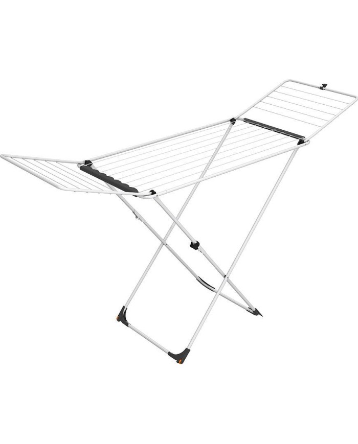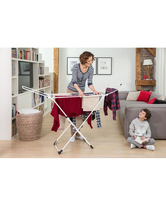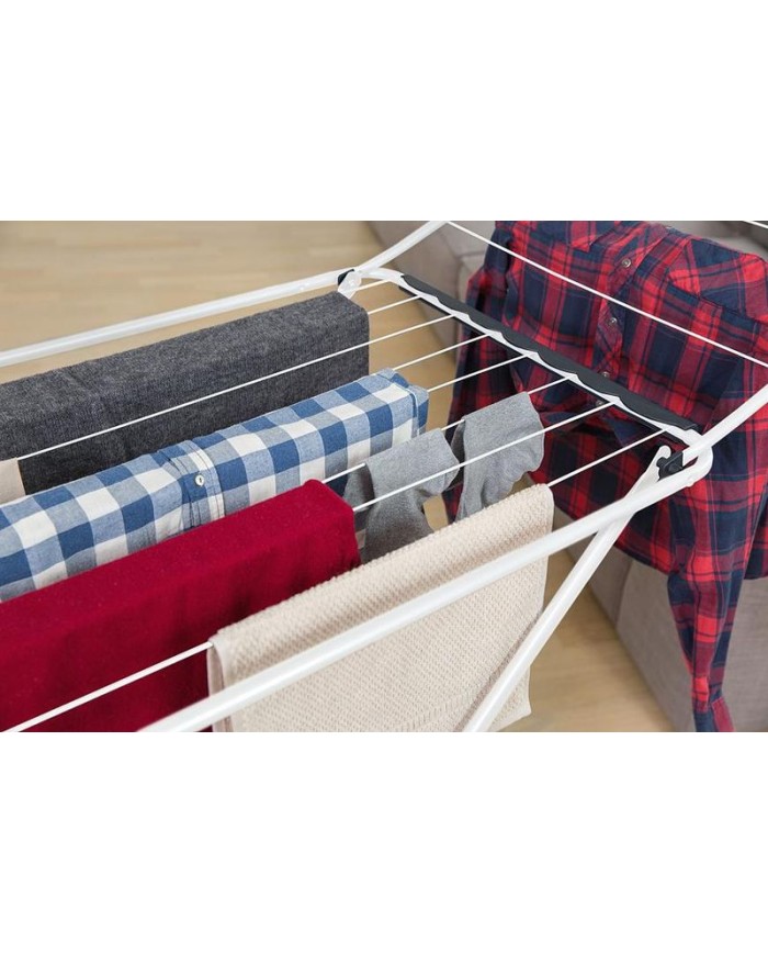 Perfektný sušiak s príslušenstvom pre ľahké sušenie vašej každodennej bielizne. Sušiaca plocha: 18 m, ideálna na každodenné použitie. Jednoduché a rýchle skladanie vďaka skladacím nohám je doplnené bezpečnostným kĺbom, ktorý zabraňuje náhodnému zloženiu sušiaku pri prenose. Bezpečnostný zámok bočných krídiel. Rozmer rozložený (š × h × v): 180 × 55 × 93 cm. Rozmer zložený (š × h × v): 55 × 5 × 129 cm. Pevný oceľový rám s bezpečnostným mechanizmom, ktorý zabraňuje náhodnému zloženiu. S kolieskami pre ľahké premiestnenie. Kompaktná veľkosť a bezpečný skladací mechanizmus na jednoduché skladovanie. Hmotnosť: 2,6 kg