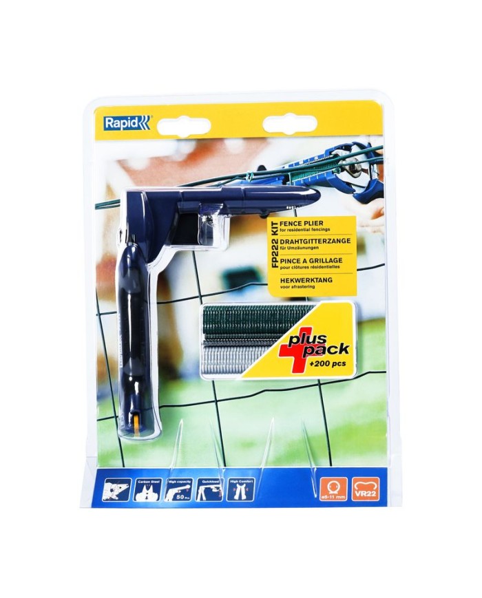 Kliešte RAPID FP222 sú vhodné pre náročnejšie záhradnícke práce ako je upevňovanie silného drôteného pletiva alebo drôtených plotov. Tieto kliešte predstavujú silné, spoľahlivé riešenie, ktoré poskytuje skvelé výsledky. Veľkokapacitný zásobník na C-sponky pre ťažké podmienky, ergonomická, mäkká rukoväť a aretácia rukoväte pre ľahké skladovanie optimalizuje výkon a pohodlie. Navrhnuté na použitie s C-sponkami VR22. 200 sponiek súčasťou balenia.