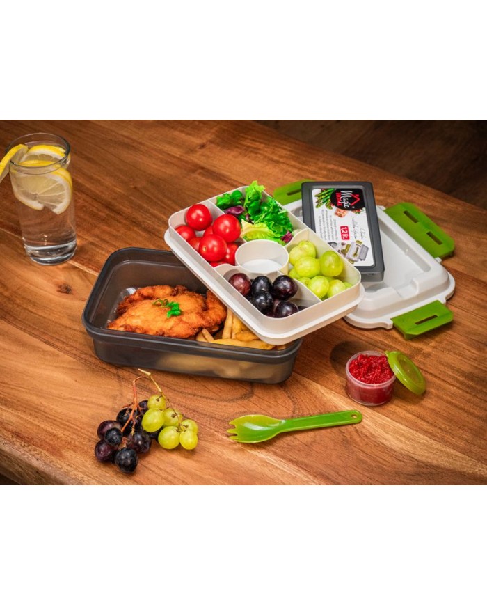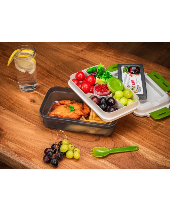 Plastový obedár MagicHome je určený na prenášanie potravín a jedál. Obsahuje vidličku/lyžicu a misku s priehradkami, prostredníctvom ktorých budete mať rozdelené jednotlivé pokrmy. Obedár má 1,2 litrový objem. Plastový obedár môžete umývať v umývačke riadu, odkladať v chladničke i mrazničke. Rozmer : 23x15x8,8 cm.