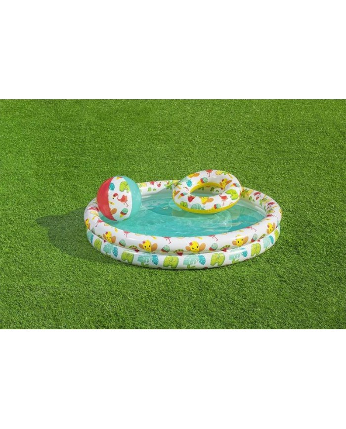 Pestrofarebný bazénik Bestway® 59460 Play Pool Set s letným motívom ľahko vytiahne deti z domu vonku na slniečko. Jeho kvalita a odolnosť je vopred testovaná, tak aby vydržal rôzne detské hry vo vode. Tento nafukovací bazénik je perfektným miestom pre všetky deti staršie ako 2 roky, ktoré sa chcú hrať vo vode počas letných horúčav. V balení nájdete aj nafukovaciu loptu a plávací kruh v rovnakom dizajne ako bazénik. Rozmery: 1,22x0,20 m.