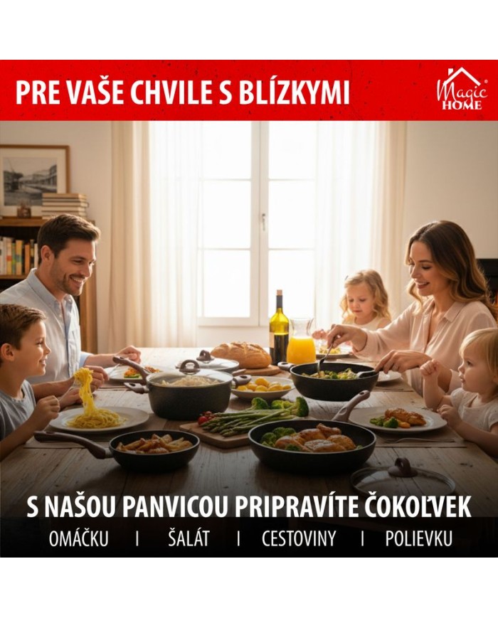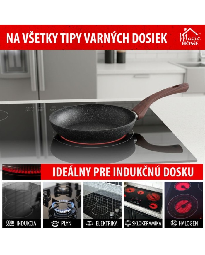 Ak si potrpíte nakvalitnékuchynské riady, táto panvica je pre Vás ako stvorená. Panvica MagicHome Black Marble Line jevyrobená zo zliatiny hliníka s nepriľnavým povrchoma3-vrstvovým mramorovým náterom. Má3 mm indukčné dno, ktoréšetrí energiu. Rukoväť obsahuje drevený náter s ochranou proti plameňu. Panvica jevhodná na všetky typy sporákov: indukcia, elektrika, plyn, sklokeramika a halogén a je tiež vhodná do umývačky riadu. Nevhodná do rúry. Ješetrná k životnému prostrediu, neobsahuje PFOA, PFOS, VOC, PB ani CD. Priemer: 26 cm.