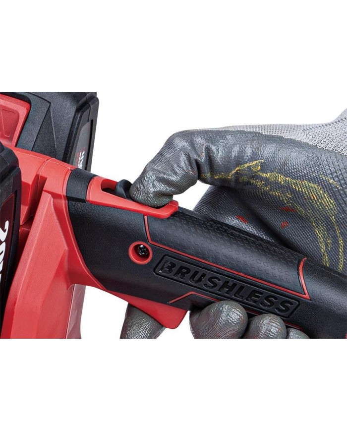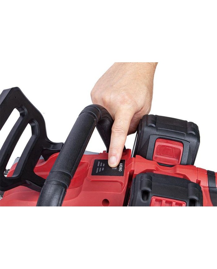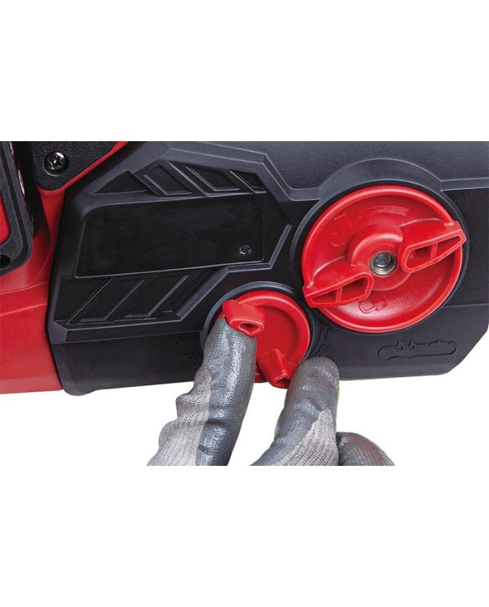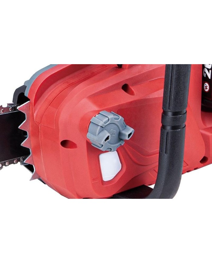 Otáčky reťaze dosahujú 15 m/s a o jej upevnenie sa postará rýchloupínací systém na bočnej strane píly. Údržbu uľahčí doplnková funkcia automatické mazanie reťaze a pridaný chránič zabezpečí bezpečnosť pri práci. Lišta je dlhá 37 cm, ideálna veľkosť pre rezanie dreva a zároveň neobmedzuje pri používaní. Reťazová brzda s uzamykacím tlačidlom pre ON/OFF prepínač zvyšujú bezpečnosť. Olejová nádrž píly má objem 250 ml a ako bonus ponúka ukazovateľ stavu náplne oleja. Akumulátor a nabíjačka nie sú súčasťou balenia!