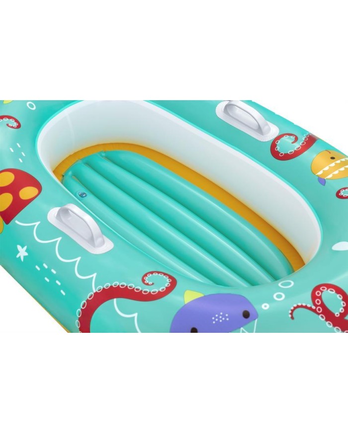 Detský nafukovací čln Bestway® Happy Crustacean je vhodný pre deti od 3 - 6 rokov. Nafukovacie dno zaisťuje väčšie pohodlie. Čln je tiež vybavený praktickými držadlami umiestnenými na bokoch. Vaše dieťa si užije slnečné dni plné zábavy na vode. Rozmery: 119x79 cm.