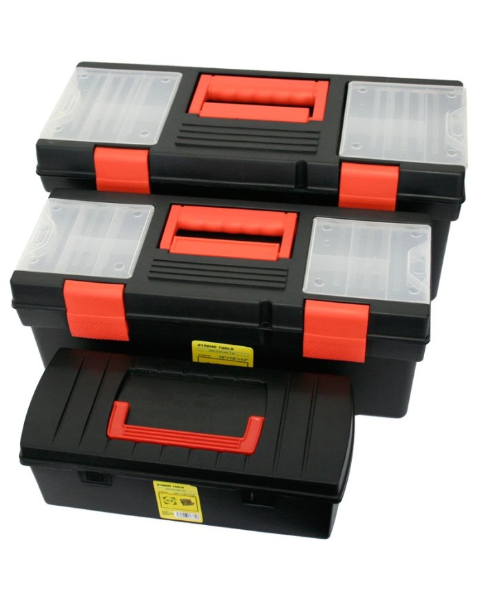 Sada 3 boxov na náradie Strend Pro by nemala chýbať vo výbave vašej dielne. Predstavuje skvelý spôsob ako ušetriť miesto v dielni. Pohodlná rukoväť umožní prenos boxu. Nosnosť 5, 8 a 10 kg poskytuje dostatok priestoru pre náradie ako skrutkovače a kladivá. Poslúži ako multifunkčný kufrík. Prehľadné veká zabezpečujú komfortný prehľad obsahu kufríka. Sada je vyrobená z plastu.