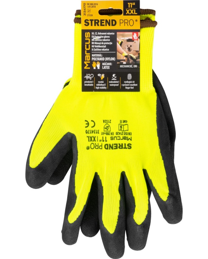 Rukavice Strend Pro Marcus sú pletené bezšvové polyamidové (nylonové) ochranné rukavice a sú potiahnuté vrstvou mikroporézneho paropriepustného latexu na dlani a prstoch. Majú pružný náplet na zápästí. Práca v týchto rukaviciach je komfortná, keďže sú priedušné, vodeodolné a poskytujú vynikajúci cit v prstoch. Sú určené na ochranu kože pred mechanickými rizikami, s úrovňou ochrany 2132A (podľa EN388: 2016+A1:2018). Veľkosť: 11"/XXL. Balenie obsahuje 12 párov rukavíc.