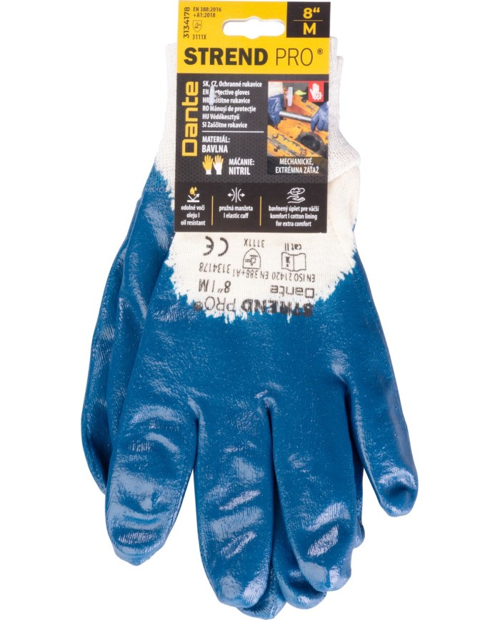 Rukavice Strend Pro Dante sú vyrobené z bavlny a majú pružný náplet. Dlaň a chrbát sú máčané do 3/4 v modrom nitrile. Odolné voči oleju. Sú určené na ochranu kože pred mechanickými rizikami, s úrovňou ochrany 3111X (podľa EN388: 2016+A1:2018). Veľkosť: 08"/M. Balenie obsahuje 12 párov rukavíc.