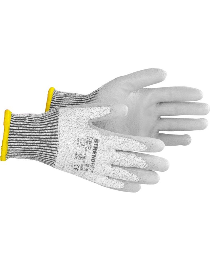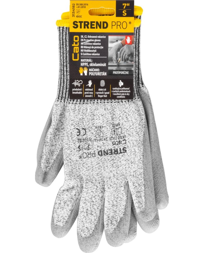 Rukavice Strend Pro Cato sú bezšvové protiporezové ochranné rukavice vyrobené z 13G HPPE a sklolaminátu s vynikajúcou odolnosťou proti oderu a porezaniu ostrím. Dlaň a prsty sú potiahnuté vrstvou sivého polyuretánu. Práca v týchto rukaviciach je komfortná, keďže sú priedušné, majú vynikajúcu priľnavosť v suchých podmienkach a poskytujú vynikajúci cit v prstoch. Sú určené na ochranu kože pred mechanickými rizikami, s úrovňou ochrany 4X43C (podľa EN388: 2016+A1:2018). Veľkosť: 07"/S. Balenie obsahuje 12 párov rukavíc.