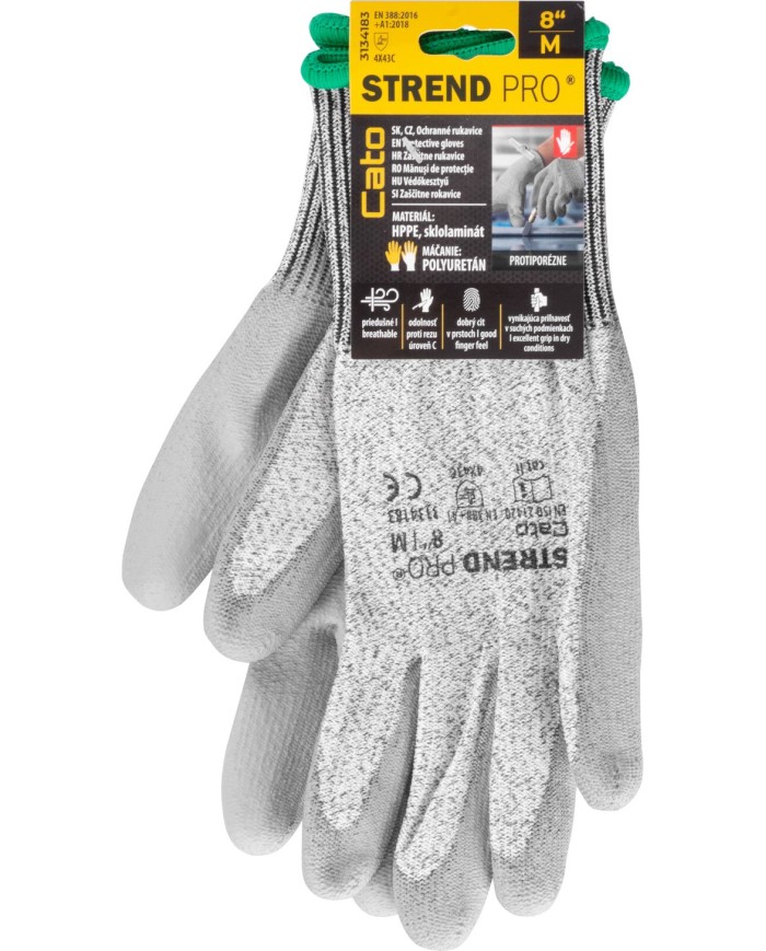 Rukavice Strend Pro Cato sú bezšvové protiporezové ochranné rukavice vyrobené z 13G HPPE a sklolaminátu s vynikajúcou odolnosťou proti oderu a porezaniu ostrím. Dlaň a prsty sú potiahnuté vrstvou sivého polyuretánu. Práca v týchto rukaviciach je komfortná, keďže sú priedušné, majú vynikajúcu priľnavosť v suchých podmienkach a poskytujú vynikajúci cit v prstoch. Sú určené na ochranu kože pred mechanickými rizikami, s úrovňou ochrany 4X43C (podľa EN388: 2016+A1:2018). Veľkosť: 08"/M. Balenie obsahuje 12 párov rukavíc.