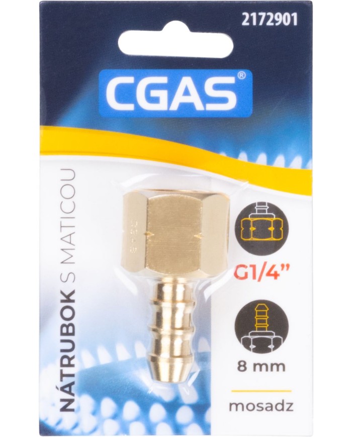 Jednocestný mosadzný nátrubok CGAS na pripojenie plynových spotrebičov k plynovým rozvodom so závitom G G1/4"-LH a maticou. Odolné voči korózii a tlaku. Priemer: 8 mm.